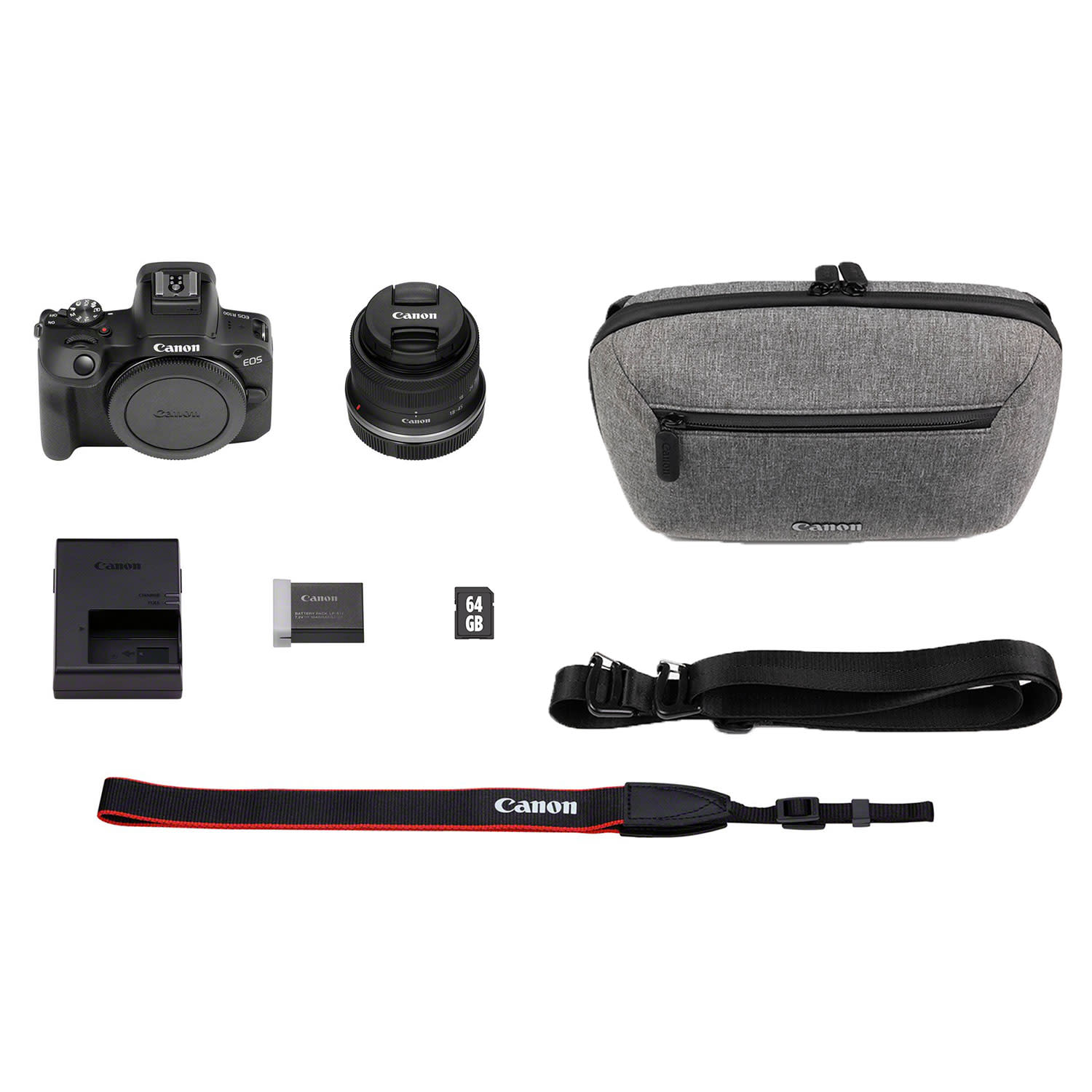 Το kit περιλαμβάνει: Σώμα EOS R100, RF-S 18-45mm F4.5-6.3 IS STM, Φορτιστής LC-E17E, Μπαταρία LP-E17, ιμάντα, καλύμματα μηχανής & μπαταριών, τσαντάκι και κάρτα μνήμης 64GB.