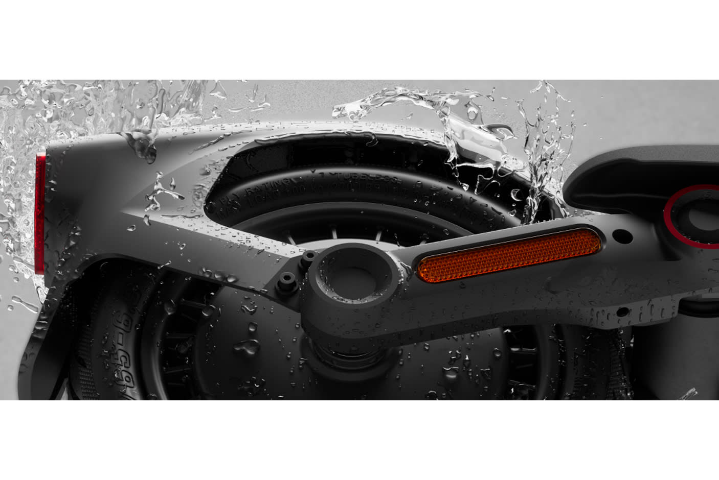 Το εμπρόσθιο φωτιστικό και οι ενσωματωμένοι δείκτες βελτιώνουν την ορατότητα, ενώ το σώμα έχει IPX5 αντοχή στο νερό, προσφέροντας αξιοπιστία σε βροχερές συνθήκες (μη φορτίζεις σε υγρό περιβάλλον).