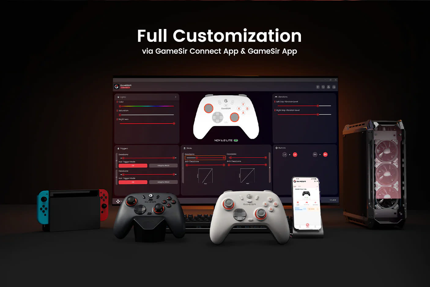 Την δόνηση του χειριστηρίου αναλαμβάνουν τα διπλά μοτέρ ακριβείας, ενώ μπόρείς να ρυθμίσεις όλες τις λεπτομέρειες των χειριστηρίων σου με τα GameSir Connect app και GameSir app.