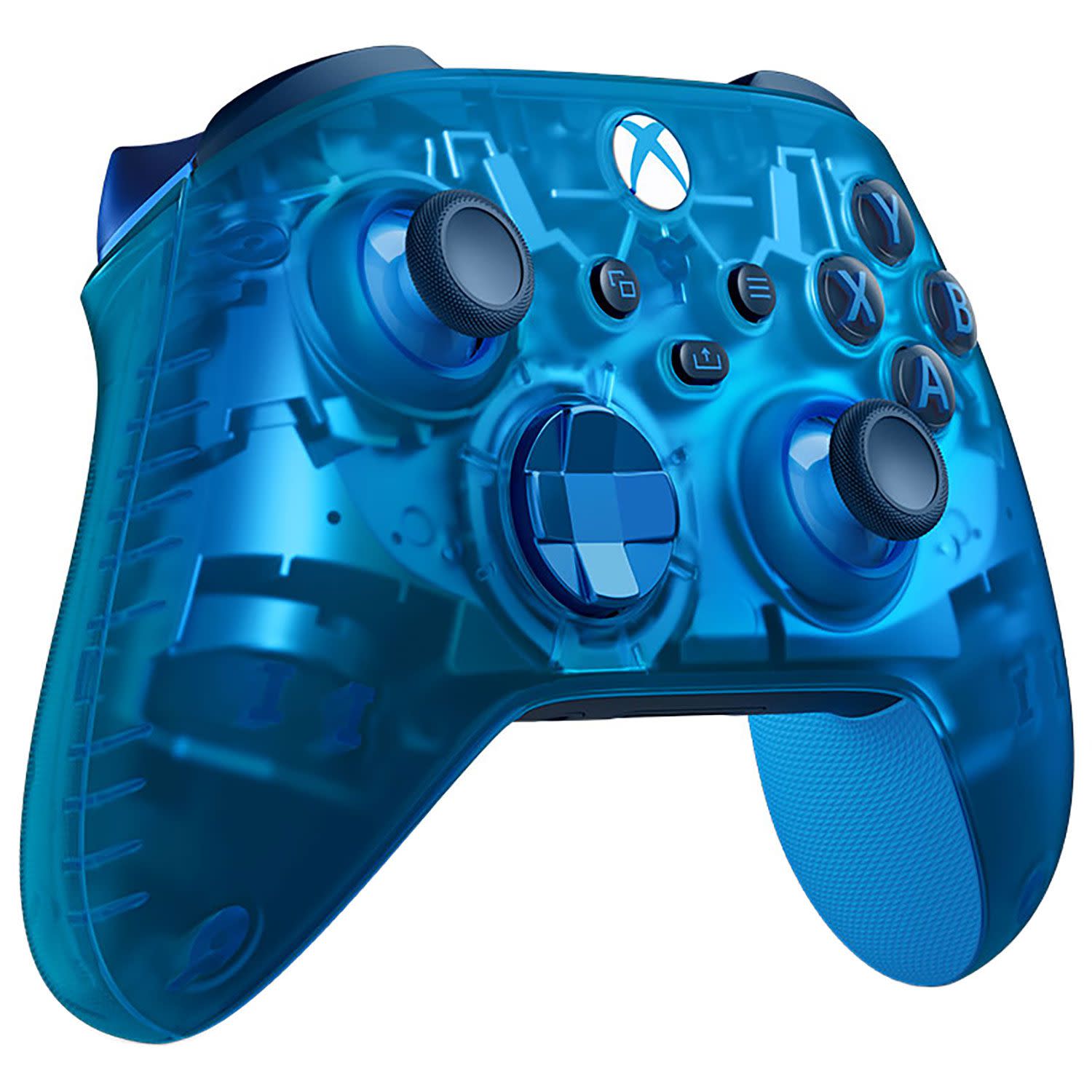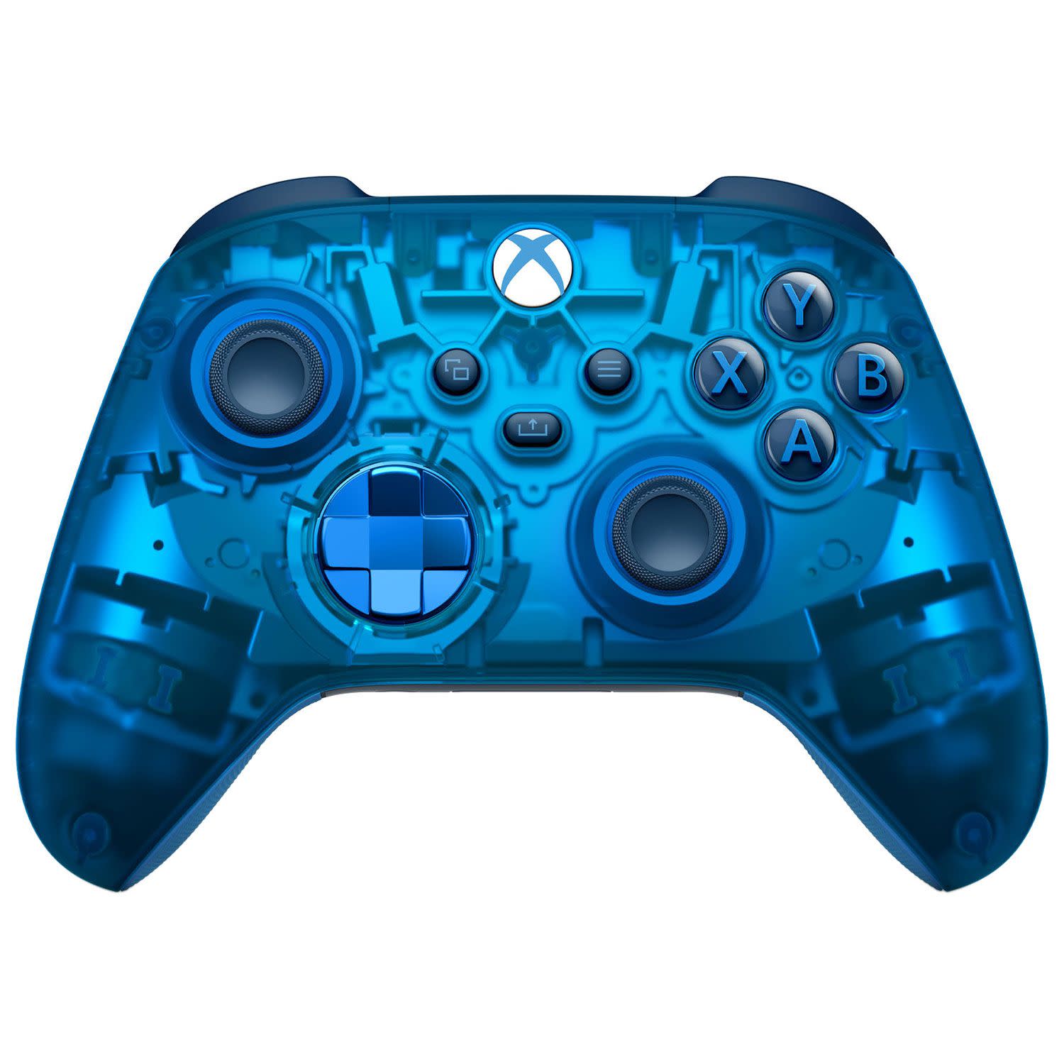 Ασύρματο χειριστήριο Xbox Ειδικής έκδοσης — Sky Cipher με μπλε διάφανη θήκη, λαβή από καουτσούκ γαλάζιου χρώματος, μεταλλικές σκανδάλες και D-pad γαλάζιου χρώματος, καθώς και Bluetooth®.