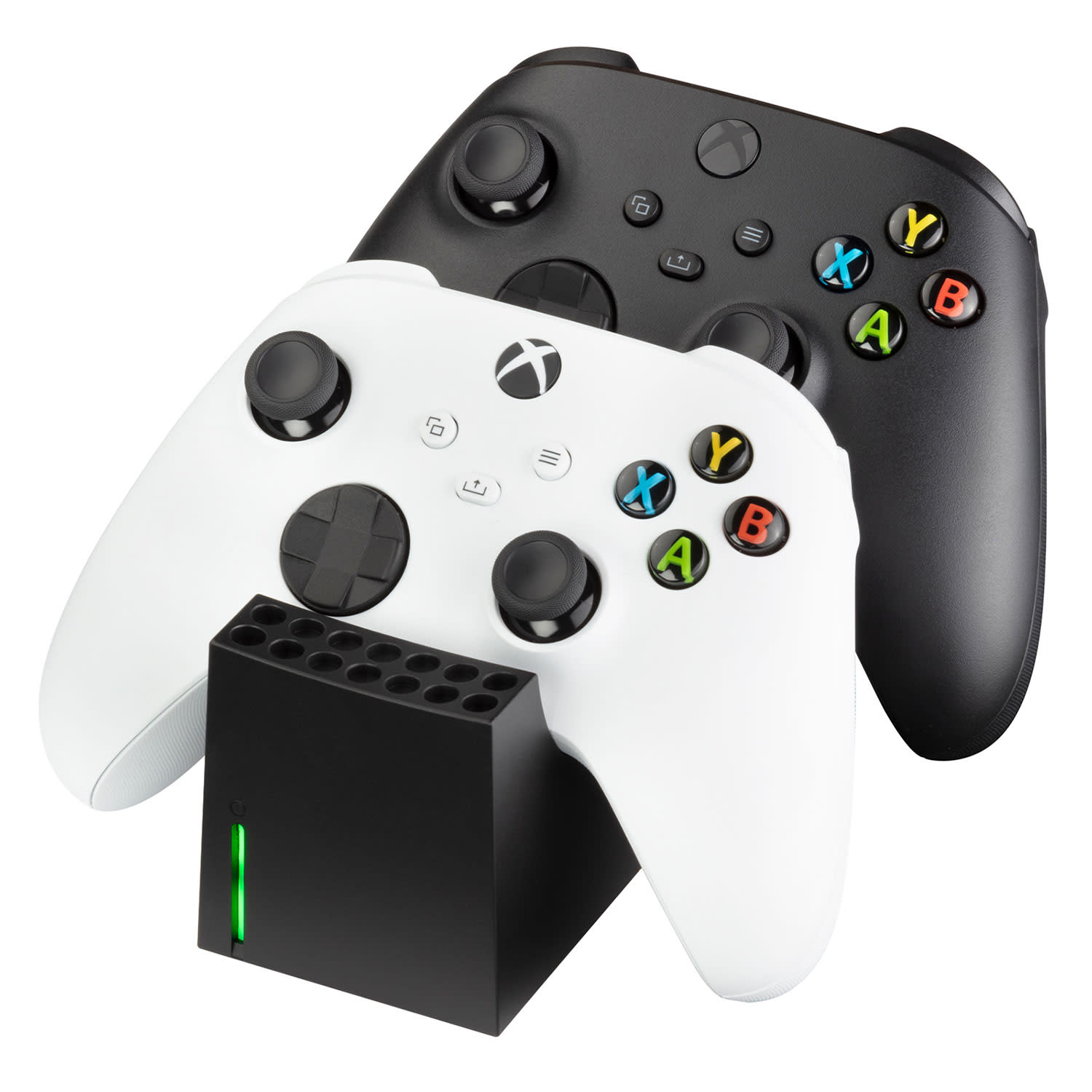 Η βάση φόρτισης δανείζεται τα βασικά στοιχεία του σχεδιασμού των νέων παιχνιδοκονσολών της Microsoft, Xbox Series X|S ώστε να ταιριάζει τέλεια από άποψη αισθητικής.