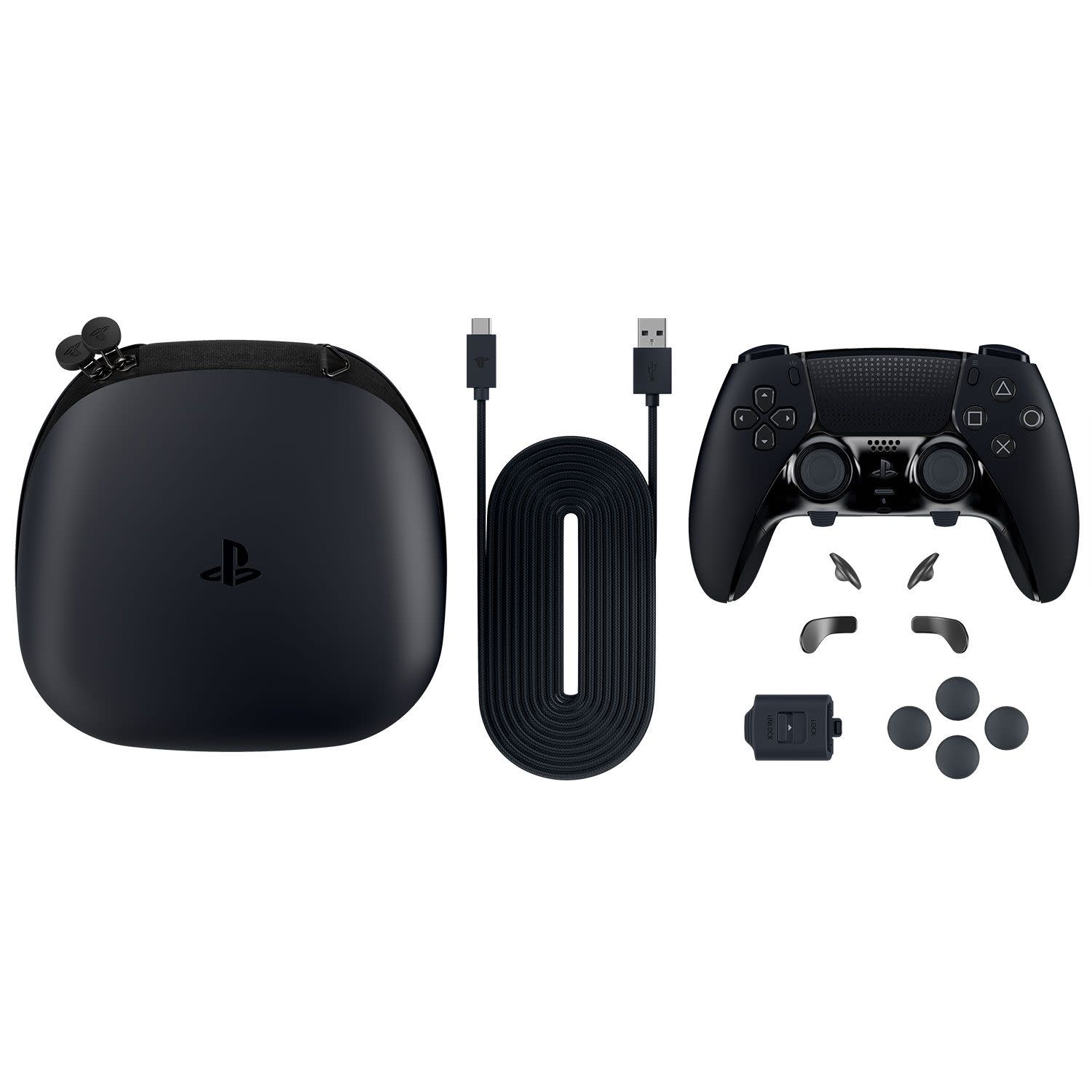 Στη συσκευασία περιλαμβάνονται: ασύρματο χειριστήριο DualSense Edge™, πλεκτό καλώδιο USB, 2x τυπικά καπάκια μοχλού, 2x ψηλά καπάκια μοχλού θόλου, 2x χαμηλά καπάκια μοχλού θόλου, 2x κουμπιά πίσω μισού θόλου, 2x κουμπιά πίσω σχήματος μοχλού, περίβλημα βύσματος και θήκη μεταφοράς.