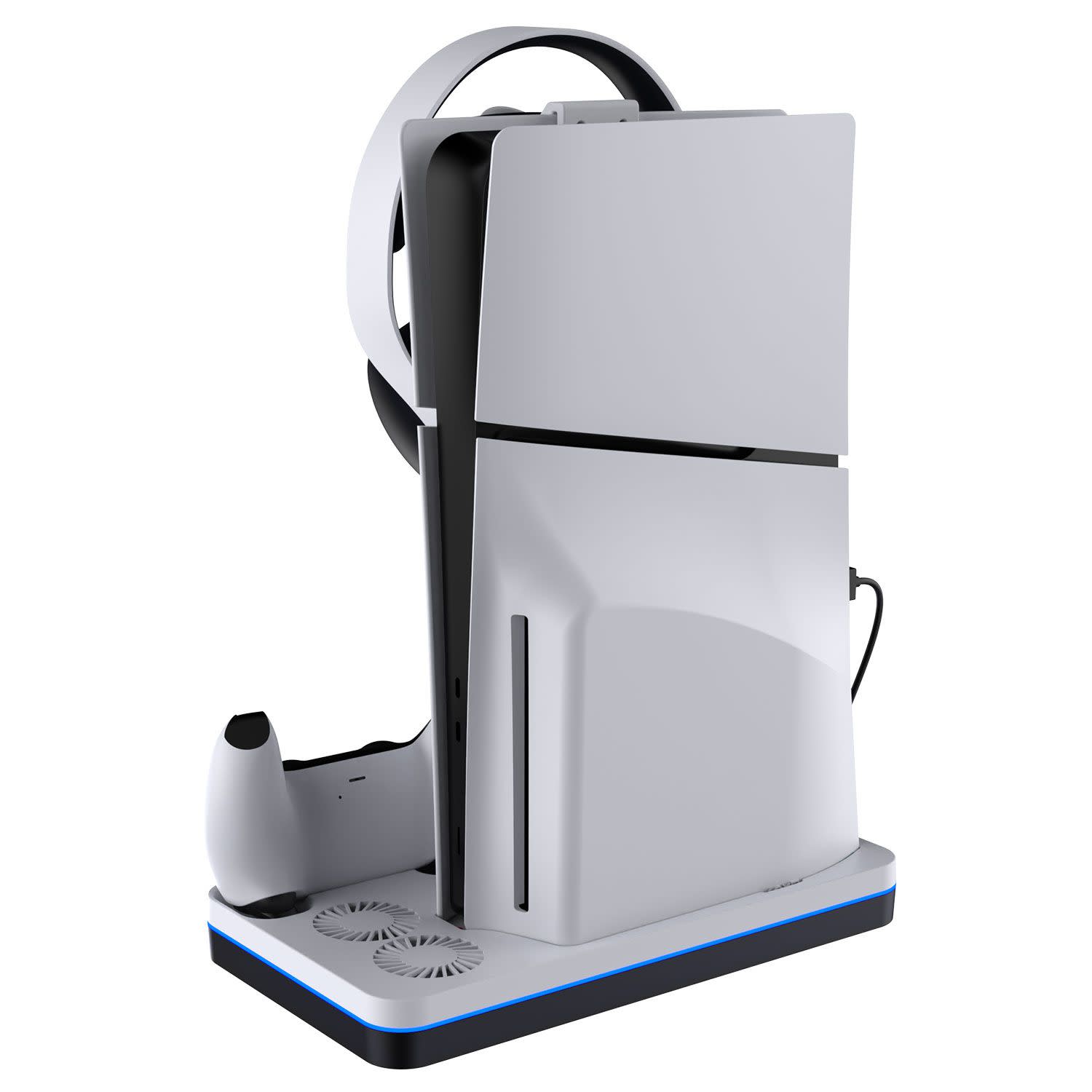 «Έξυπνη» βάση κάθετης σχεδίασης για κονσόλες PS5™ (Slim Disc/Digital) με μπάρα φωτισμού, 3x θύρες USB, ρυθμιζόμενο ανεμιστήρα και δυνατότητα ταυτόχρονης φόρτισης για έως και 2x ασύρματα χειριστήρια.