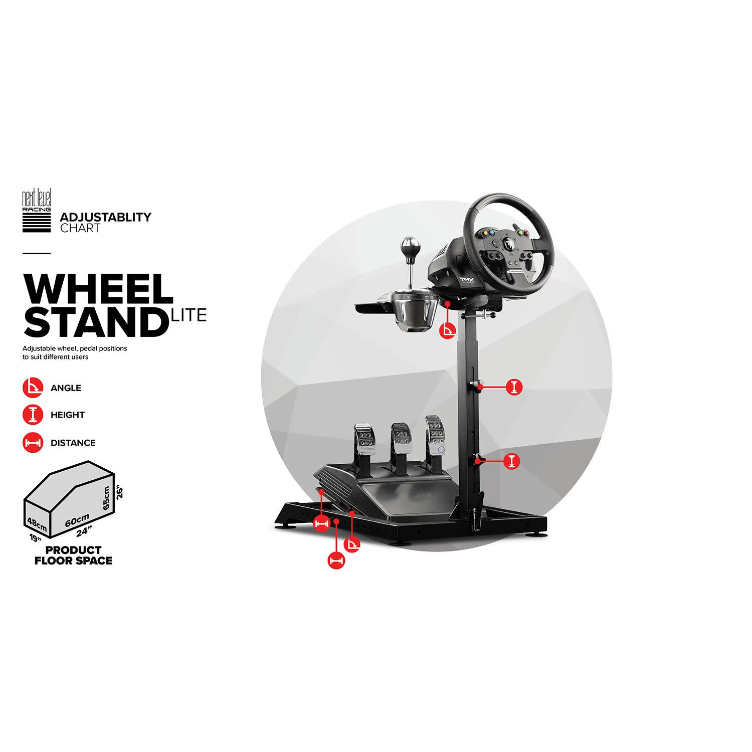 Το Next Level Racing® Wheel Stand Lite είναι μια συμπαγής και εξαιρετικά προσαρμόσιμη βάση για τις περισσότερες τιμονιέρες, τα πεντάλ και τους μοχλούς αλλαγής ταχυτήτων.