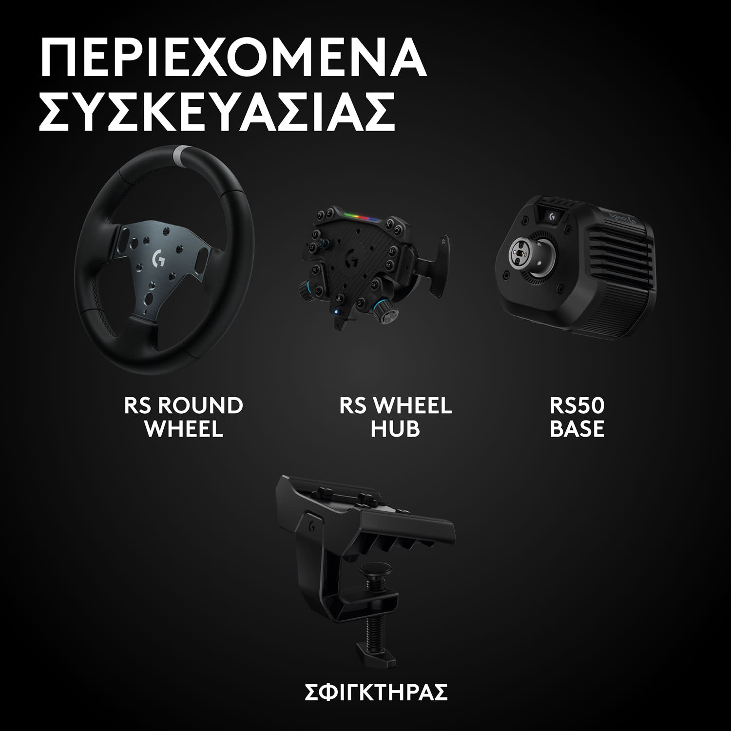 Logitech G RS50 System για προσομοίωση αγώνων ταχύτητας, με RS50 Wheel Base με σύστημα απευθείας οδήγησης Direct Drive 8 Nm, RS Wheel Hub με 13 κουμπιά και RS Round Wheel 11” — συμβατό με Xbox/PC.