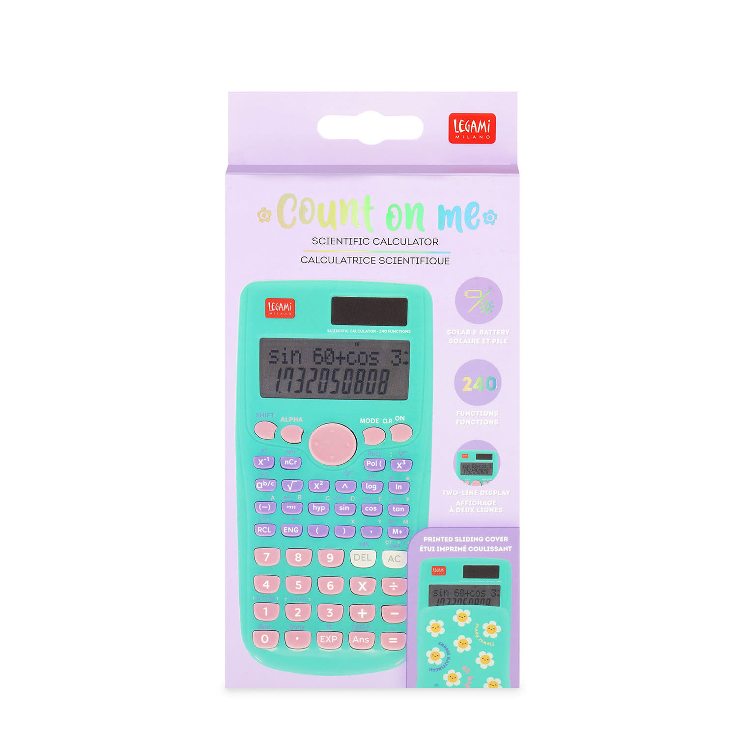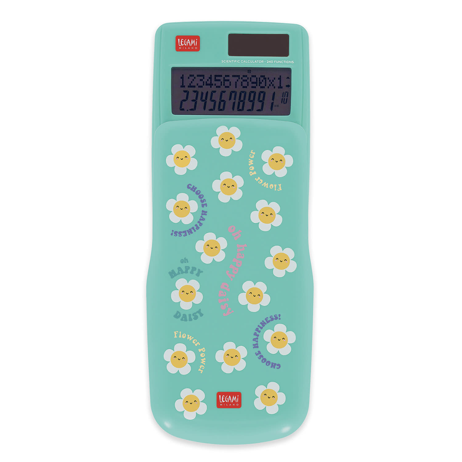 Μία αριθμομηχανή που… έχει λύση για όλα! Η επιστημονική αριθμομηχανή «Daisy» της Legami μπορεί να λύσει μαθηματικά προβλήματα εξίσου εύκολα με εξισώσεις. Διαθέτει 240 λειτουργίες και έναν εξαιρετικά κομψό σχεδιασμό. Περιλαμβάνει επιστημονικές λειτουργίες, στατιστικούς υπολογισμούς και μνήμη, ενώ λειτουργεί τόσο με μπαταρία (1 x 1.5V LR44 μπαταρία, δεν περιλαμβάνεται) όσο και με ηλιακή ενέργεια.