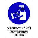 Πινακίδα προτροπής χρήσης αντισηπτικού διαλύματος. Είναι πλαστικοποιημένη ώστε να είναι ανθεκτική και σε εξωτερικούς χώρους και να μπορεί να καθαρίζεται χωρίς να φθείρεται.