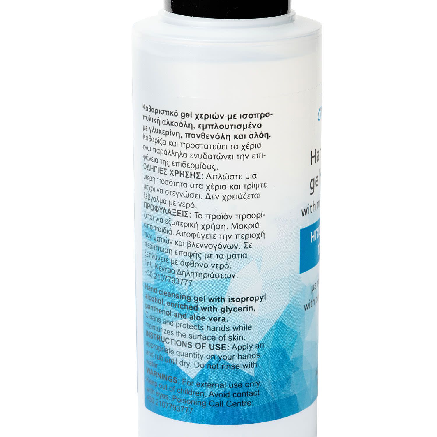 Καθαριστικό gel χεριών με ισοπροπυλική αλκοόλη, εμπλουτισμένο με γλυκερίνη, πανθενόλη και αλόη. Καθαρίζει και προστατεύει τα χέρια, ενώ παράλληλα ενυδατώνει την επιφάνεια της επιδερμίδας.