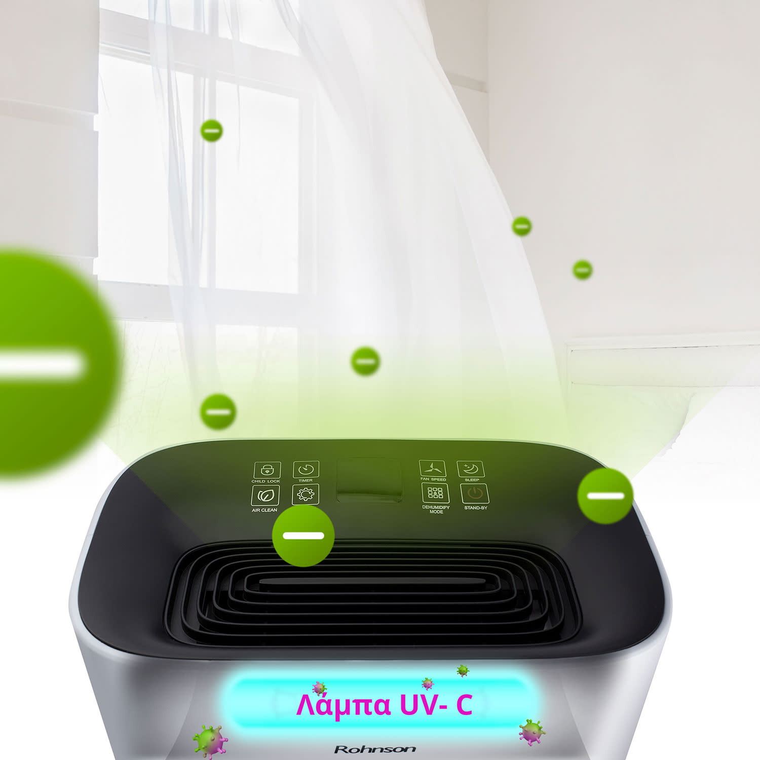 Rohnson MOD R-9920 αφυγραντήρας με κάλυψη χώρου 120㎡, δυνατότητα αφύγρανσης 20lt/24h και Ultraviolet λάμπα τύπου C για να εισπνέεις την καλύτερη ποιότητα αέρα από το διαμέρισμα ή το γραφείο σου!