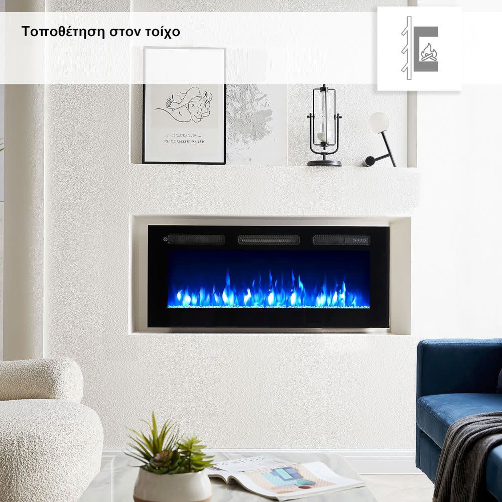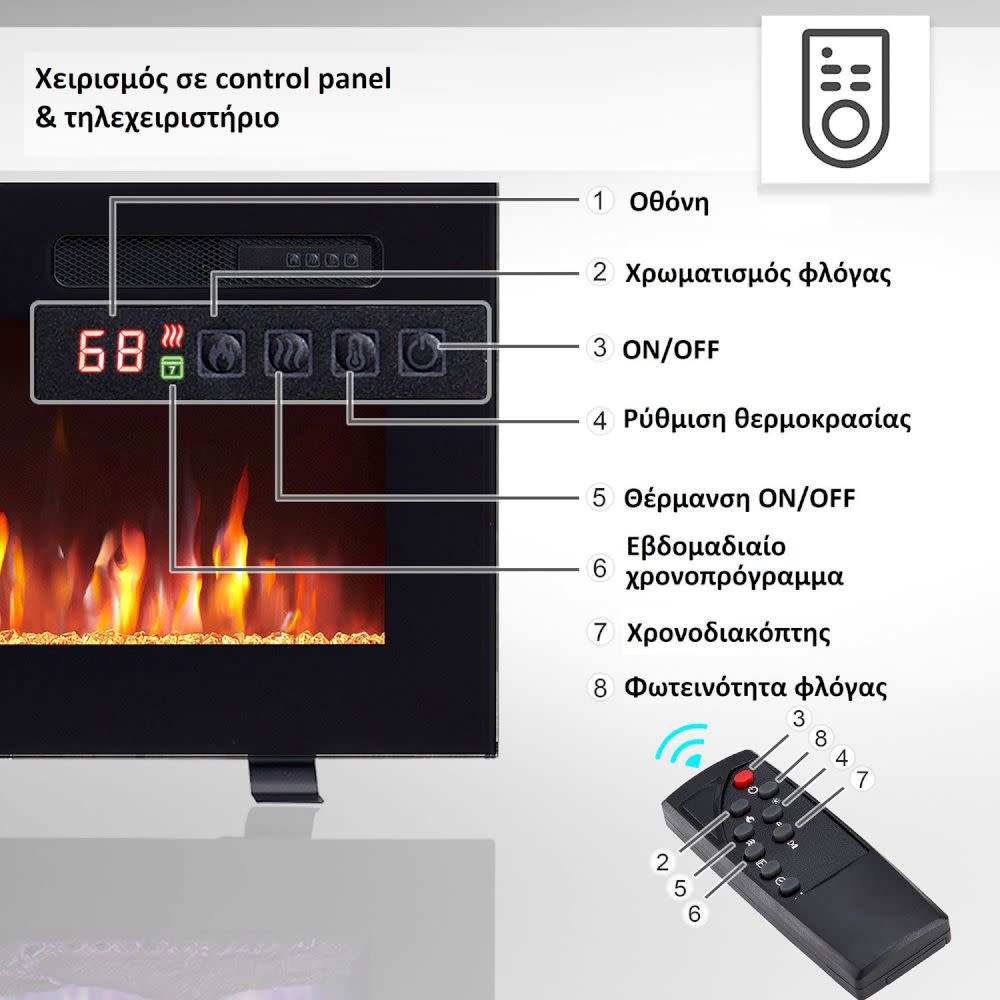 Διαθέτει επιπλέον τηλεχειριστήριο για ρύθμιση της επιθυμητής θερμοκρασίας, χρωματισμών της φλόγας, χρωματισμών της θράκας της εστίας, ένταση φωτεινότητας και χρονοπρογράμματος λειτουργίας έως 8 ώρες.