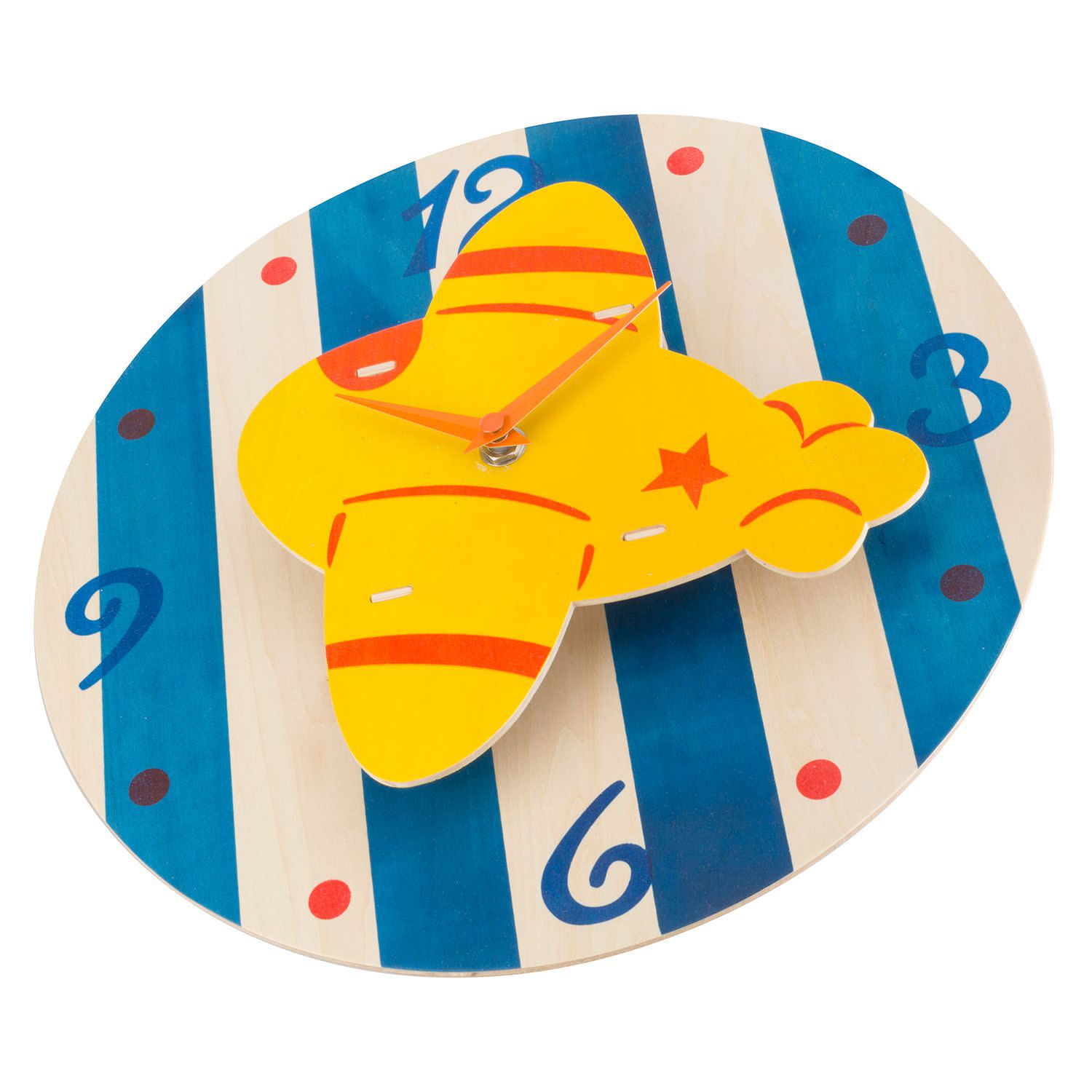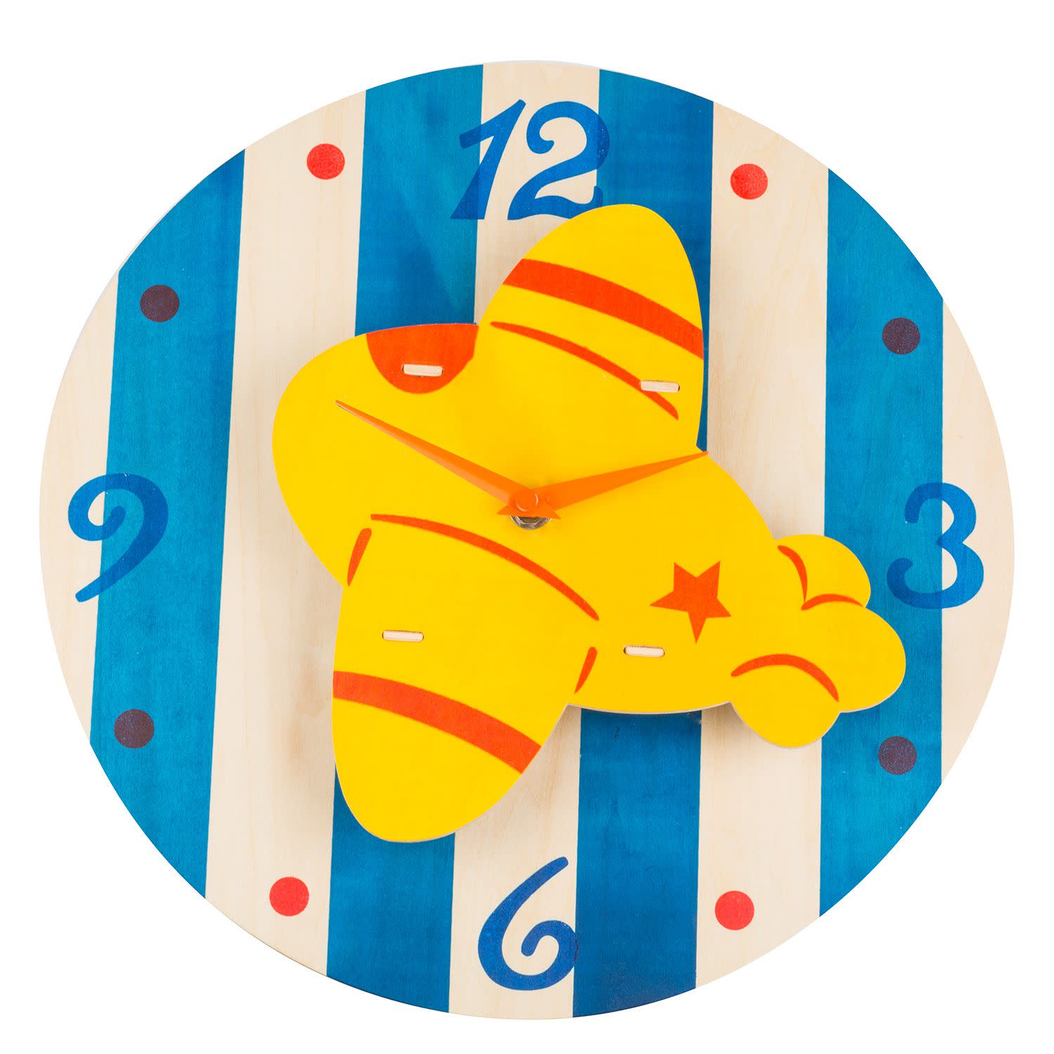 Αν ψάχνεις ένα διαφορετικό και ιδιαίτερο ρολόι για το παιδικό αγορίστικο δωμάτιο, μπορείς να σταματήσεις το ψάξιμο. Το ξύλινο ρολόι τοίχου έχει πρωτότυπο design, αφού από το κέντρο του «ξεπηδάει» ένα πολύχρωμο αεροπλανάκι που θα ξετρελάνει το μικρό σου! Τοποθέτησέ το στο δωμάτιo και μάθε του με ευχάριστο τρόπο την ώρα αλλά και τους αριθμούς!