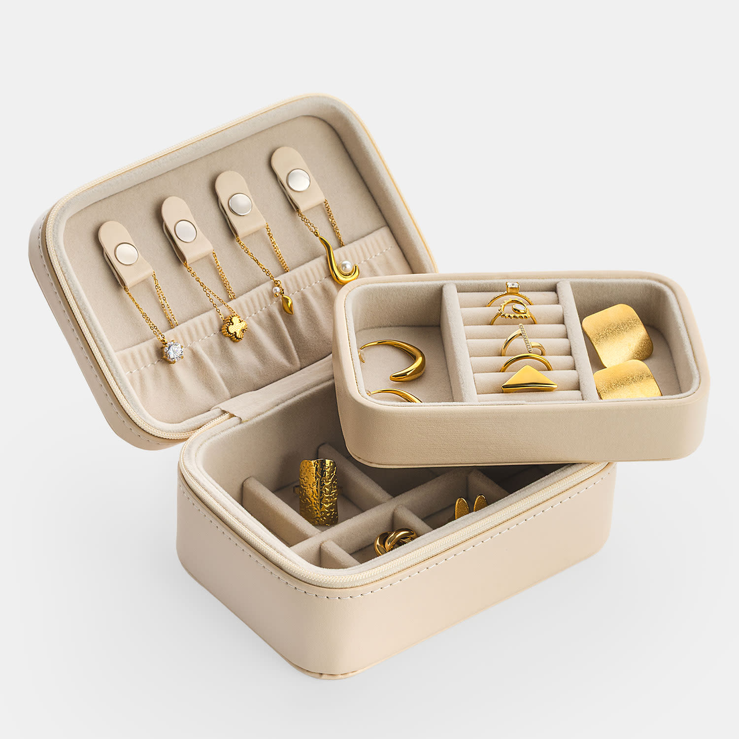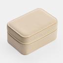 Μία minimal, μικρή κοσμηματοθήκη Sentio σε μπεζ χρώμα, ιδανική τόσο για τα ταξίδια σου, αλλά και για τον προσωπικό σου χώρο. Το μέγεθός της σού επιτρέπει να έχεις μαζί σου ό,τι θα χρειαστείς για το ταξίδι σου, καθώς διαθέτει θήκες για σκουλαρίκια, δαχτυλίδια και κολιέ, ώστε να μη σου λείψει τίποτα. Ωστόσο το μέγεθος είναι κατάλληλο και για το δωμάτιό σου για να μπορείς να αποθηκεύεις τα κοσμήματα με άνεση.