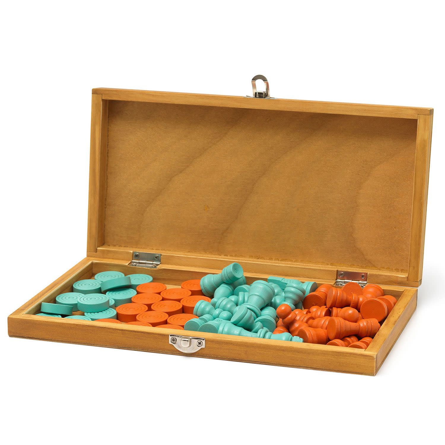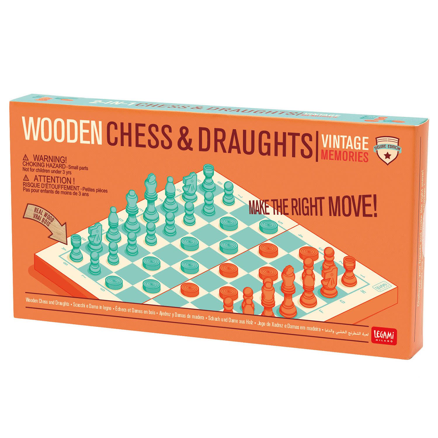 Ξύλινο Σκάκι και Ντάμα, ένα από τα μοναδικά χαρακτηριστικά του είναι ο συνδυασμός χρωμάτων: Τα τετράγωνα στο σκάκι Legami είναι ξύλινα και γαλάζια, για να φιλοξενήσουν αντίστοιχα πορτοκαλί και γαλάζια πιόνια και πούλια παιχνιδιού! Μόλις τελειώσει το παιχνίδι, τα κομμάτια μπορούν να αποθηκευτούν μέσα στο ταμπλό, το οποίο είναι πτυσσόμενο. Με υλικό κατασκευασμένο από πιστοποιημένο ξύλο πεύκου.