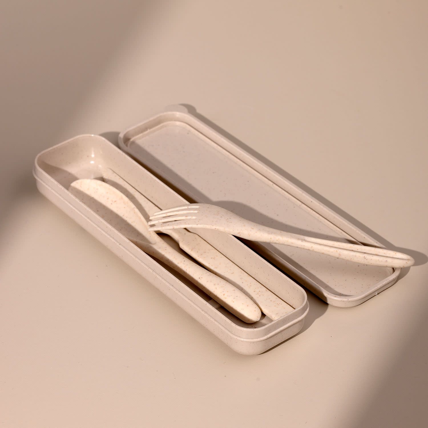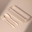 Ένα πρακτικό σετ μαχαιροπίρουνα για να έχεις στην τσάντα σου. Περιλαμβάνει πιρούνι, κουτάλι και μαχαίρι σε μπεζ χρώμα.
