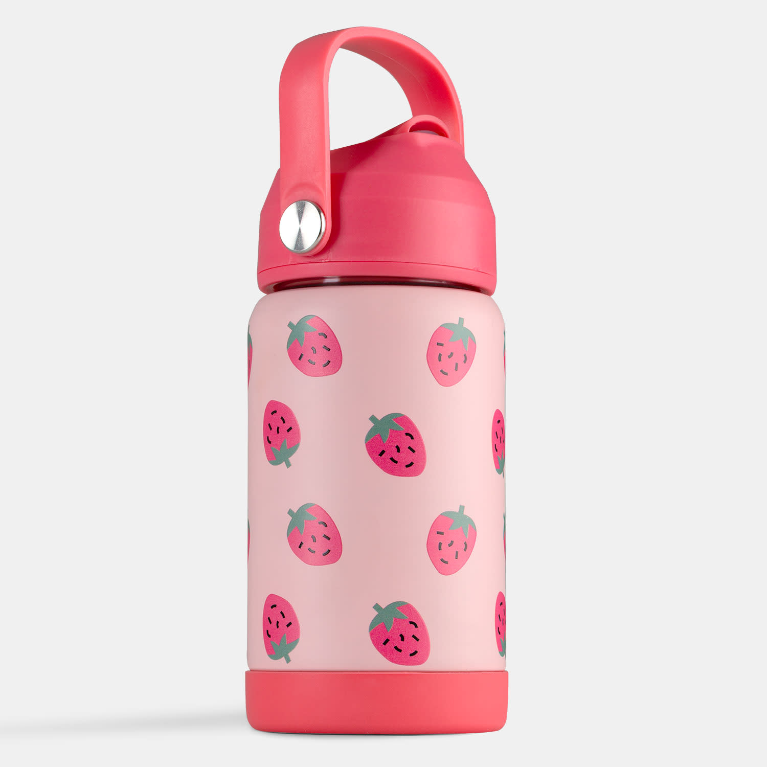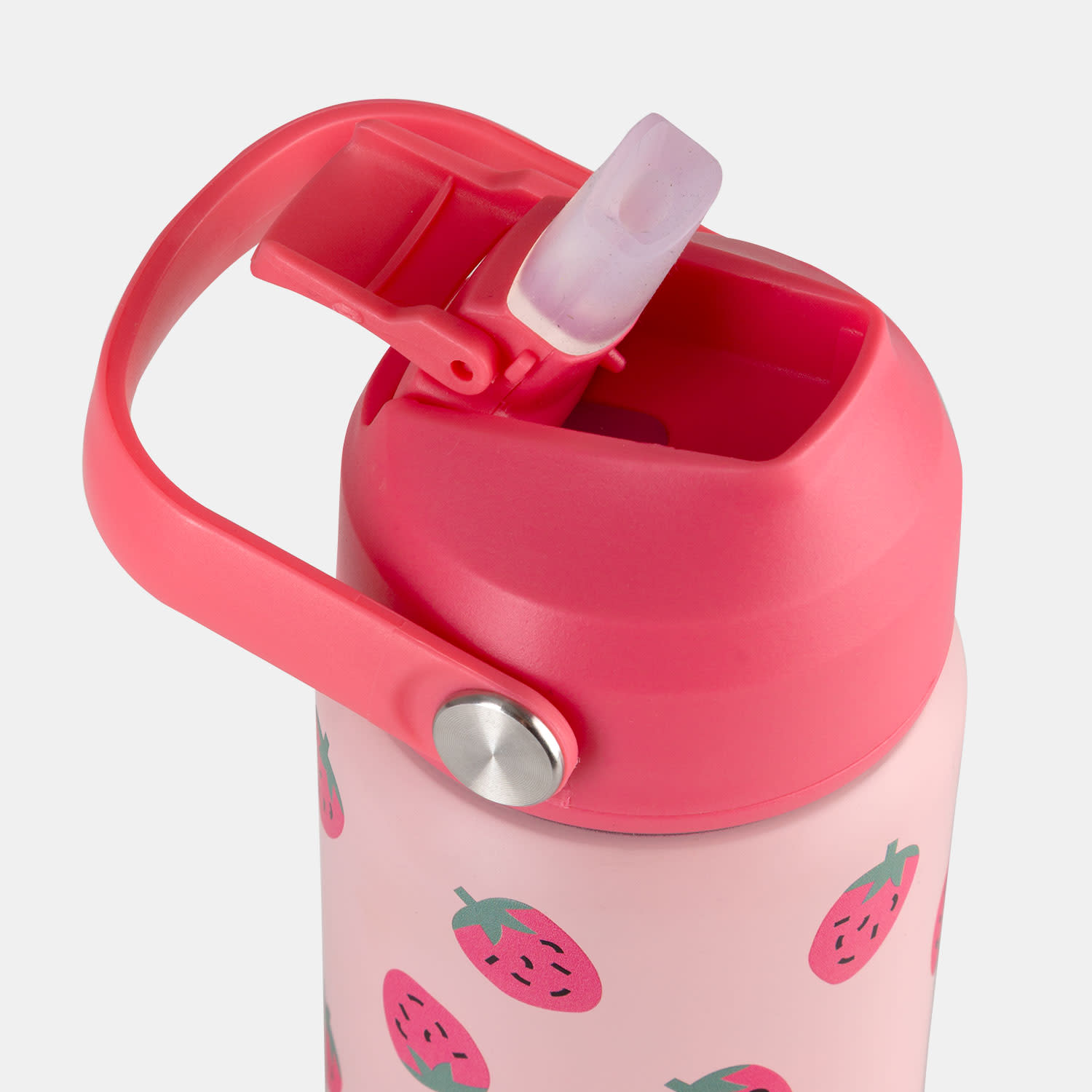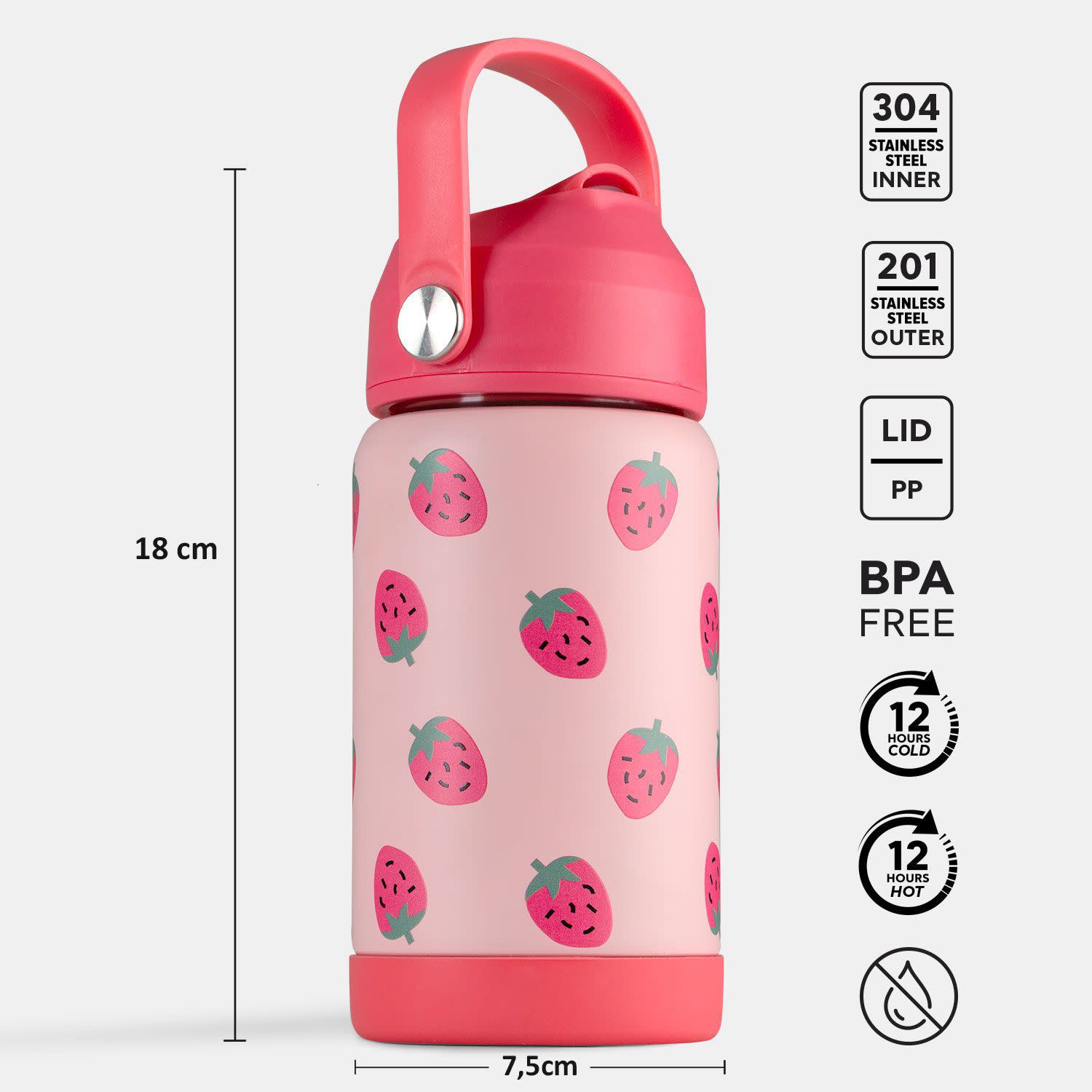 Ανοξείδωτο παγούρι της Goomby με ειδική λαβή και μοναδικό σχέδιο «Strawberries»! Απόλαυσε τα αγαπημένα σου δροσερά ή χλιαρά ροφήματα, όπου κι αν είσαι και πιες με άνεση από το καλαμάκι του.