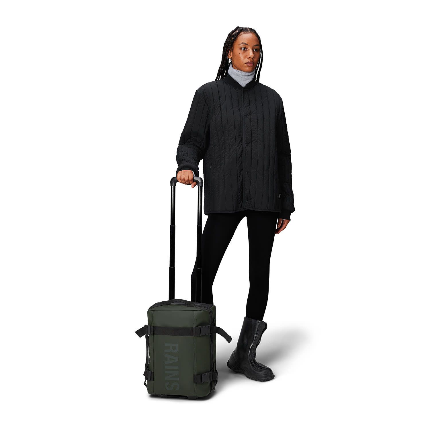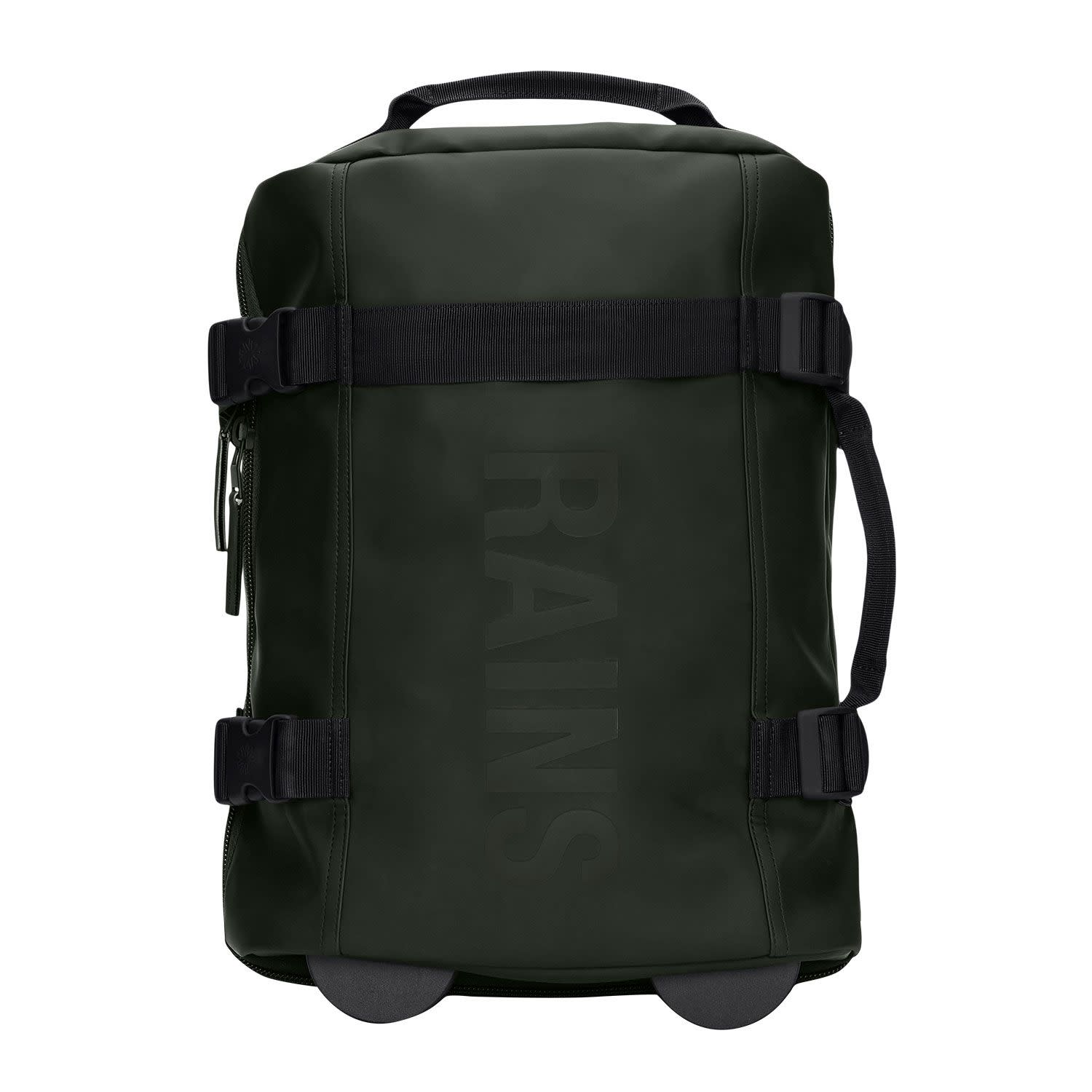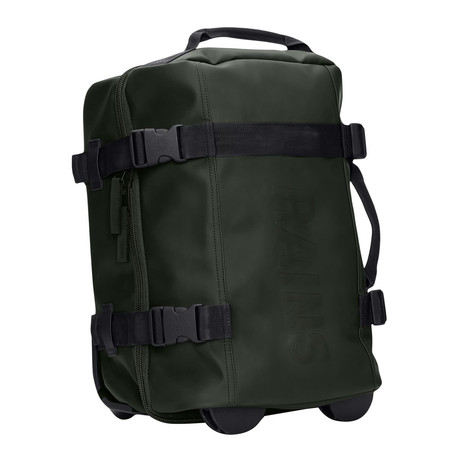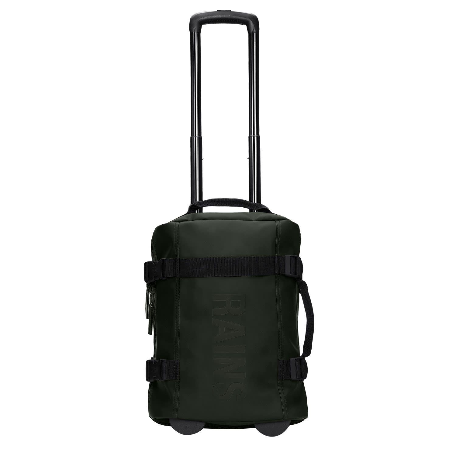 Μίνι βαλίτσα καμπίνας της Rains σε πράσινο χρώμα, μορφή trolley και διαστάσεις χειραποσκευής. Είναι αδιάβροχη, διαθέτει τηλεσκοπική λαβή καθώς και αθόρυβα ροδάκια για εύκολη μεταφορά!