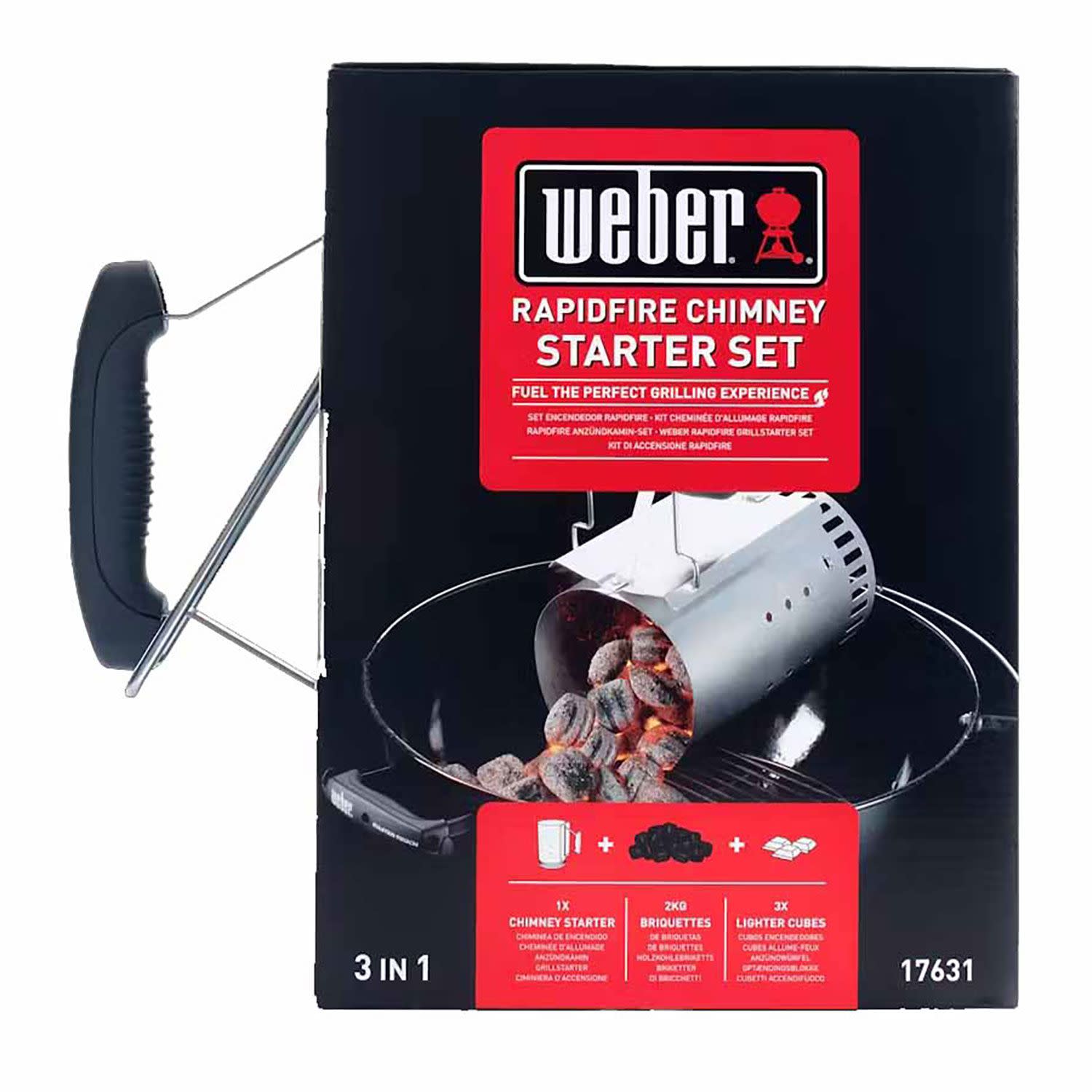 Σετ με όλα όσα χρειάζονται για το άναμμα της ψησταριάς κάρβουνου! Περιέχει 2kg μπρικέτες Weber, 3 κύβους προσανάμματος και δοχείο εκκίνησης Weber Chimney Starter! Γέμισε το δοχείο εκκίνησης με μπρικέτες και σε λίγο θα ακούσεις τον χαρακτηριστικό ήχο των πυρακτωμένων κάρβουνων, που σημαίνει ότι σύντομα θα απολαμβάνεις ένα αξέχαστο γεύμα!