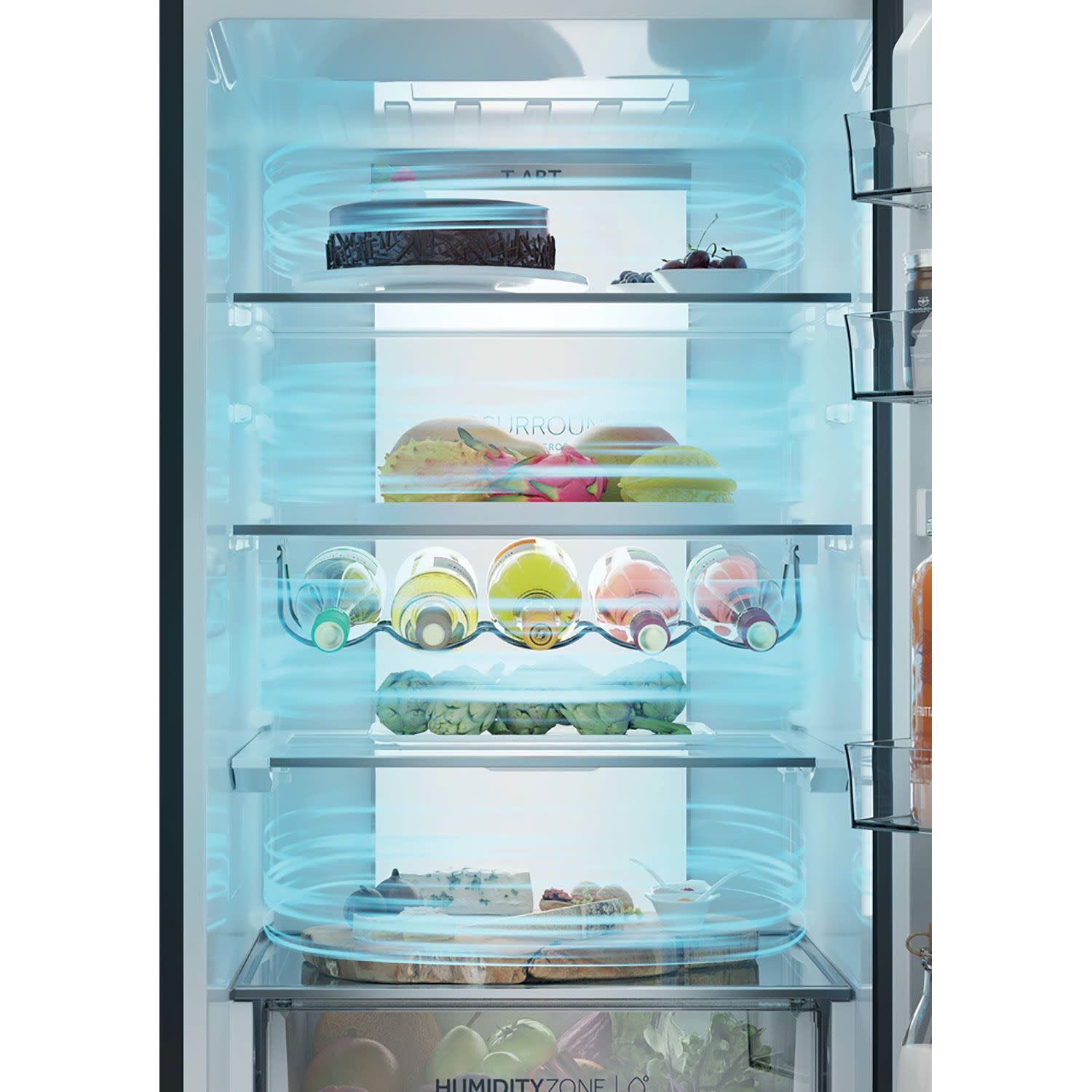 Με την τεχνολογία Fresher Tech της Haier, Air Surround, ο αέρας ρέει γύρω από το ψυγείο με πιο ήπιο και απαλό τρόπο από ειδικούς πλευρικούς αεραγωγούς, κατανέμοντας ομοιογενώς τον κρύο αέρα που αγκαλιάζει τα τρόφιμα σε ολόκληρο τον θάλαμο του ψυγείου, χωρίς να βάλει απευθείας τρόφιμα και να τα αφυδατώνει, όπως συμβαίνει στα συμβατικά ψυγεία. Γι' αυτό το Haier Air Surround διατηρεί τη γεύση και τη φρεσκάδα του φαγητού έως και 99% μετά από 7 ημέρες, όπως την πρώτη μέρα αγοράς.