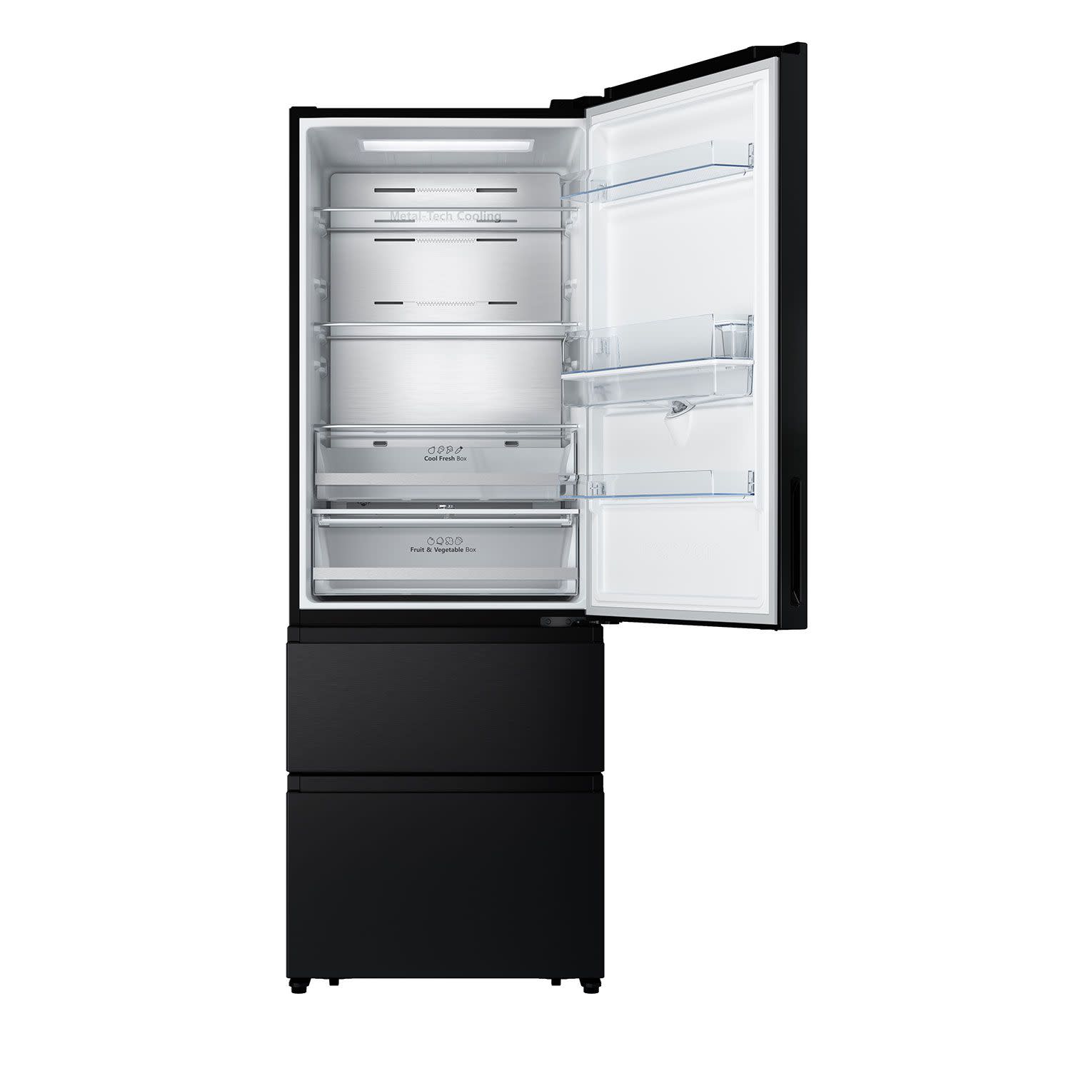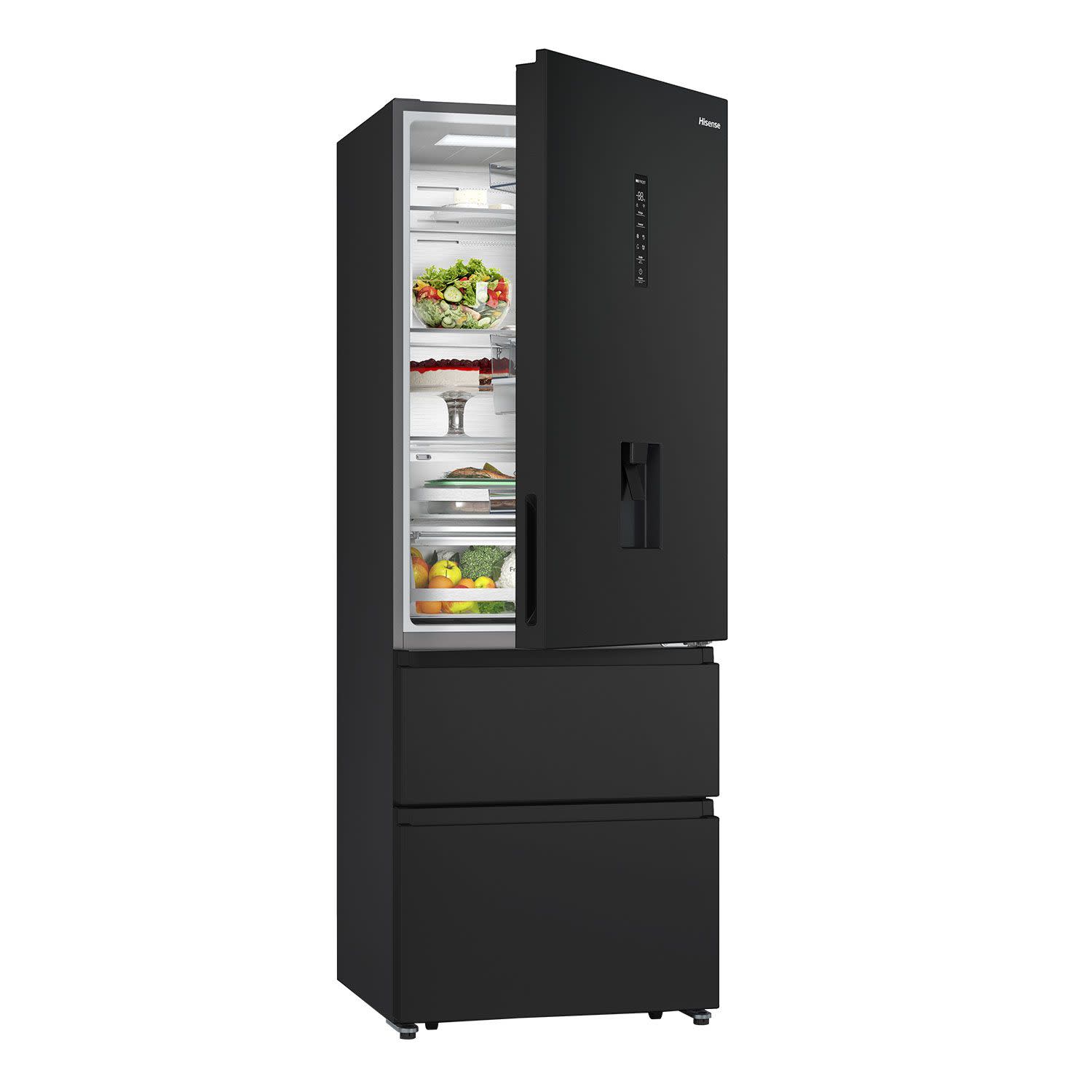 Total No Frost ψυγειοκαταψύκτης Hisense σε μαύρο χρώμα, καθαρής χωρητικότητας 493Lt, με ανθεκτικά γυάλινα ράφια και δυνατότητα σύνδεσης WiFi για να τον χειρίζεσαι ακόμα και από απόσταση.