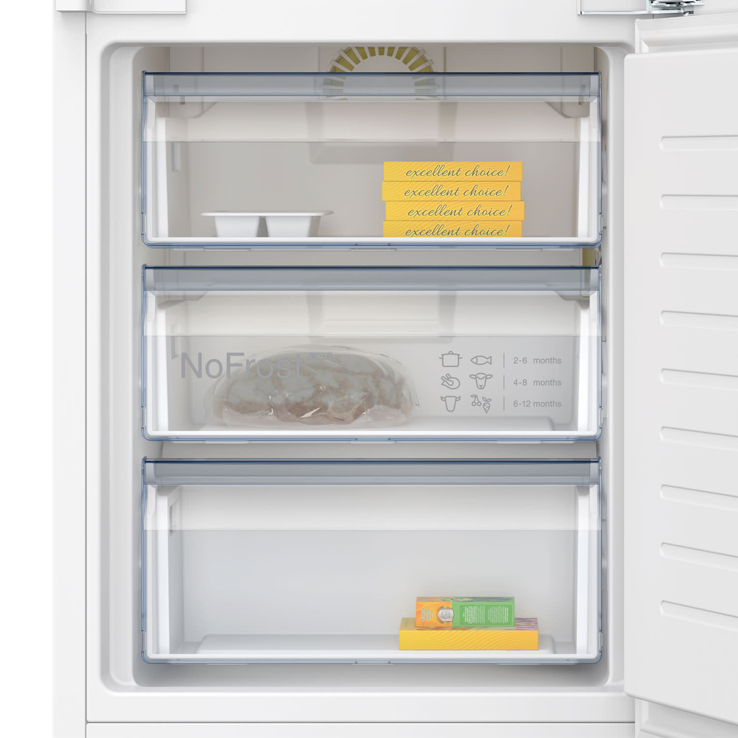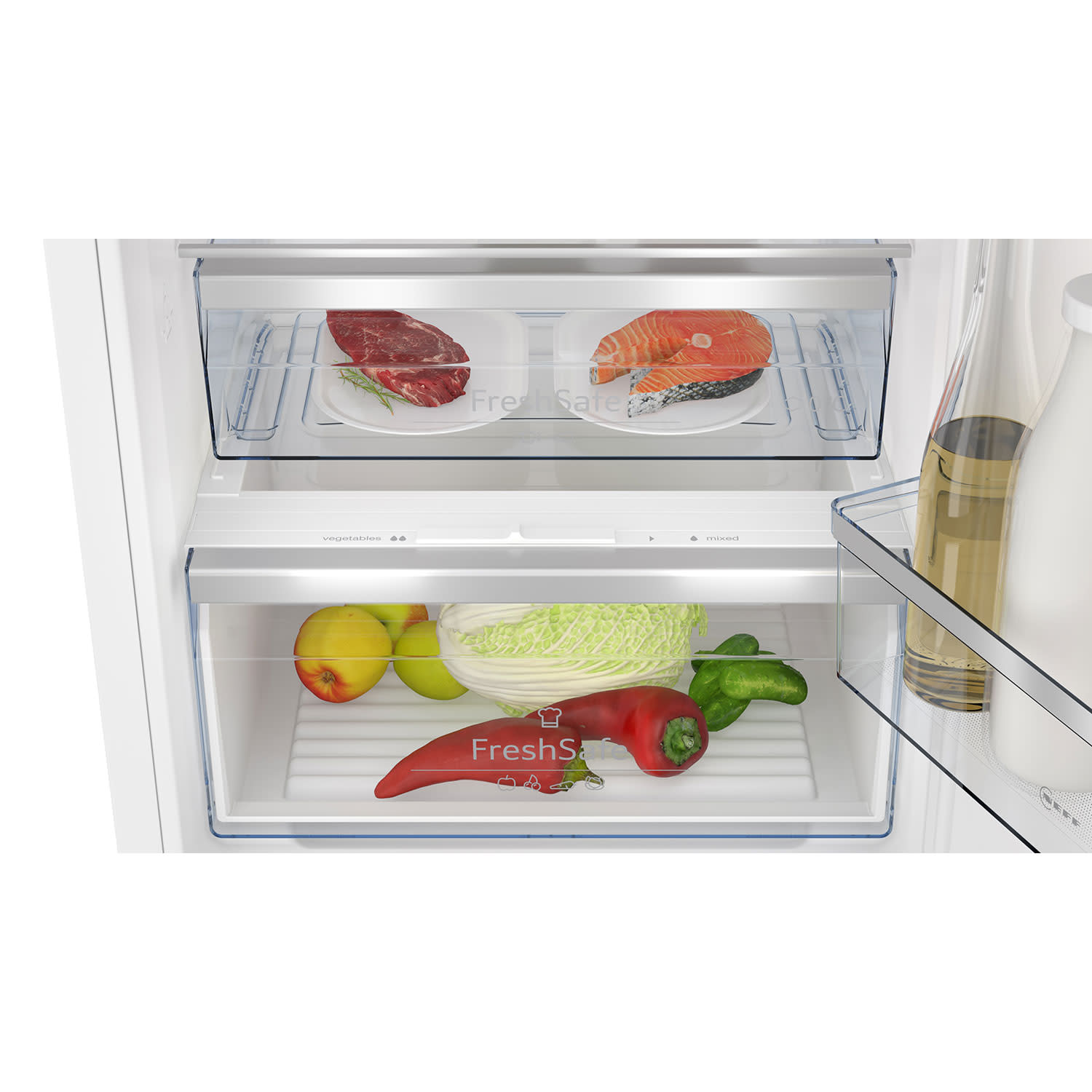 Εντοιχιζόμενος ψυγειοκαταψύκτης Neff No Frost με XL χωρητικότητα 290Lt. Τοποθέτησε το κρέας και το ψάρι σου στο ειδικό συρτάρι FreshSafe 1 και διατήρησέ τα φρέσκα για πολύ καιρό!