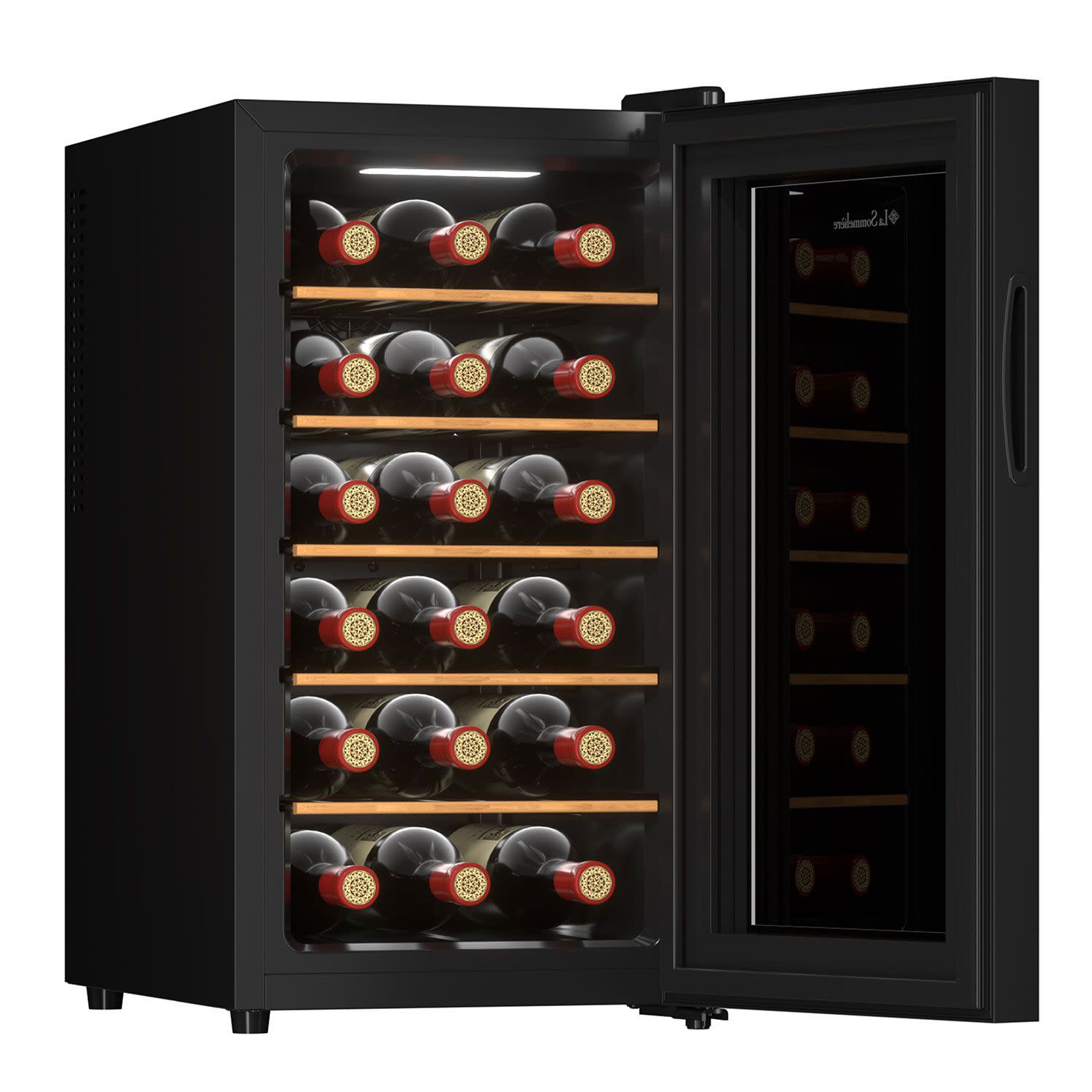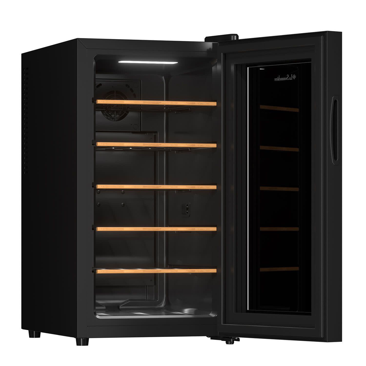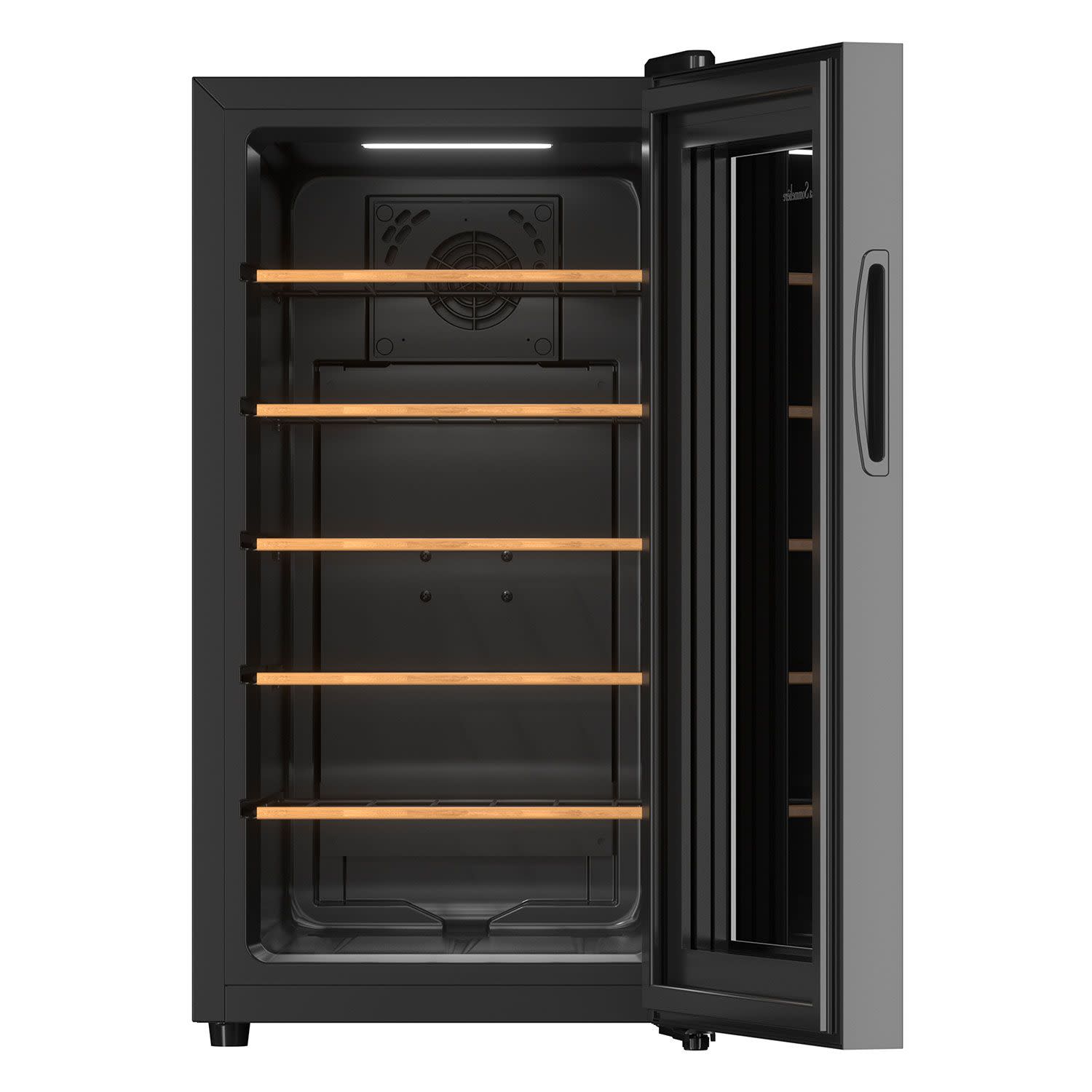 La sommeliere συντηρητής κρασιών με 5 συρμάτινα ράφια με ξύλινη επίστρωση και χωρητικότητα για 18 φιάλες! Διαθέτει μία ζώνη θερμοκρασίας, LED φωτισμό και γυάλινη πόρτα.