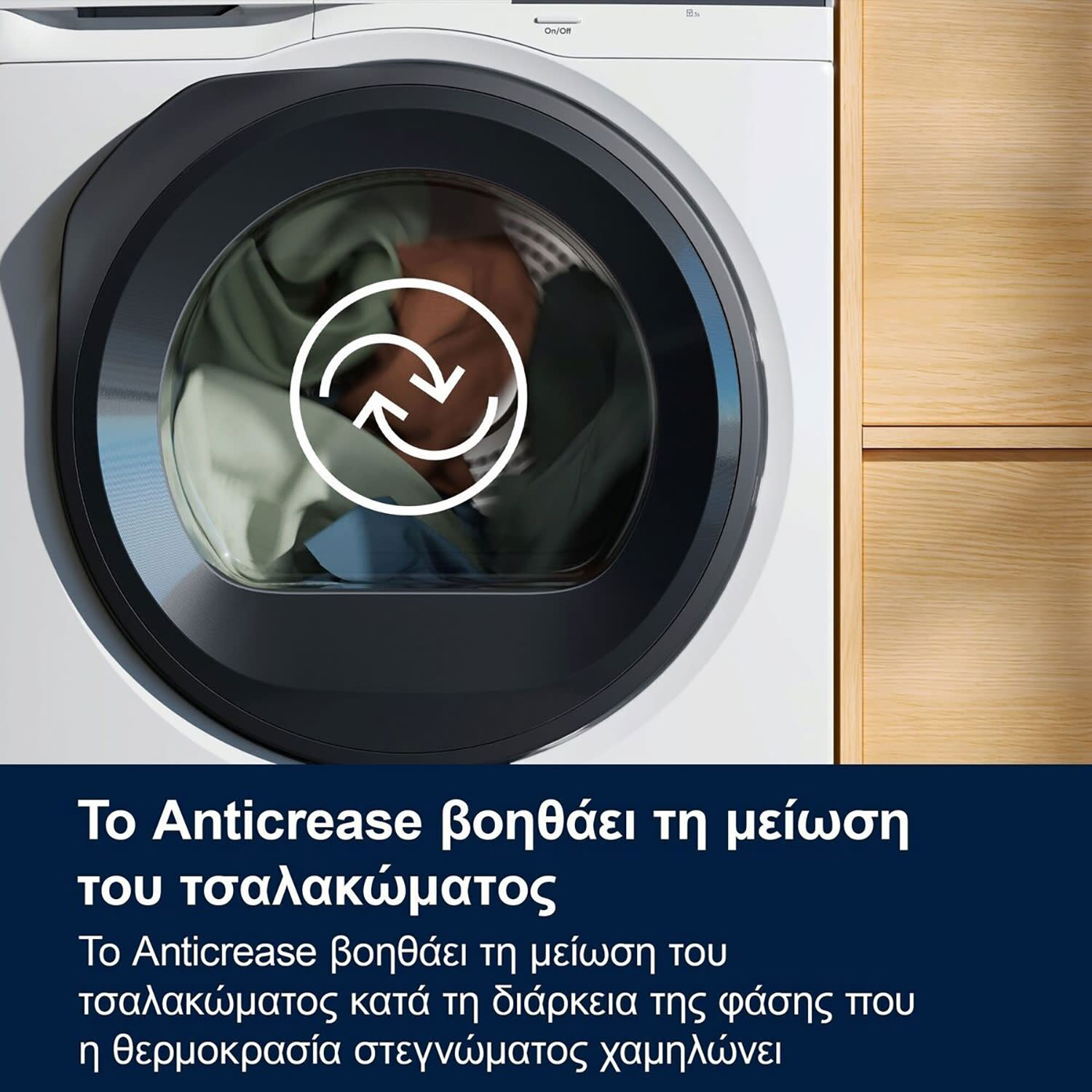 Η τεχνολογία Anticrease επιτρέπει στον κάδο να περιστρέφεται και με τις δύο κατευθύνσεις, συμβάλλοντας στο να μειωθούν οι ζάρες στα ρούχα, κατά τη φάση ψύξης.