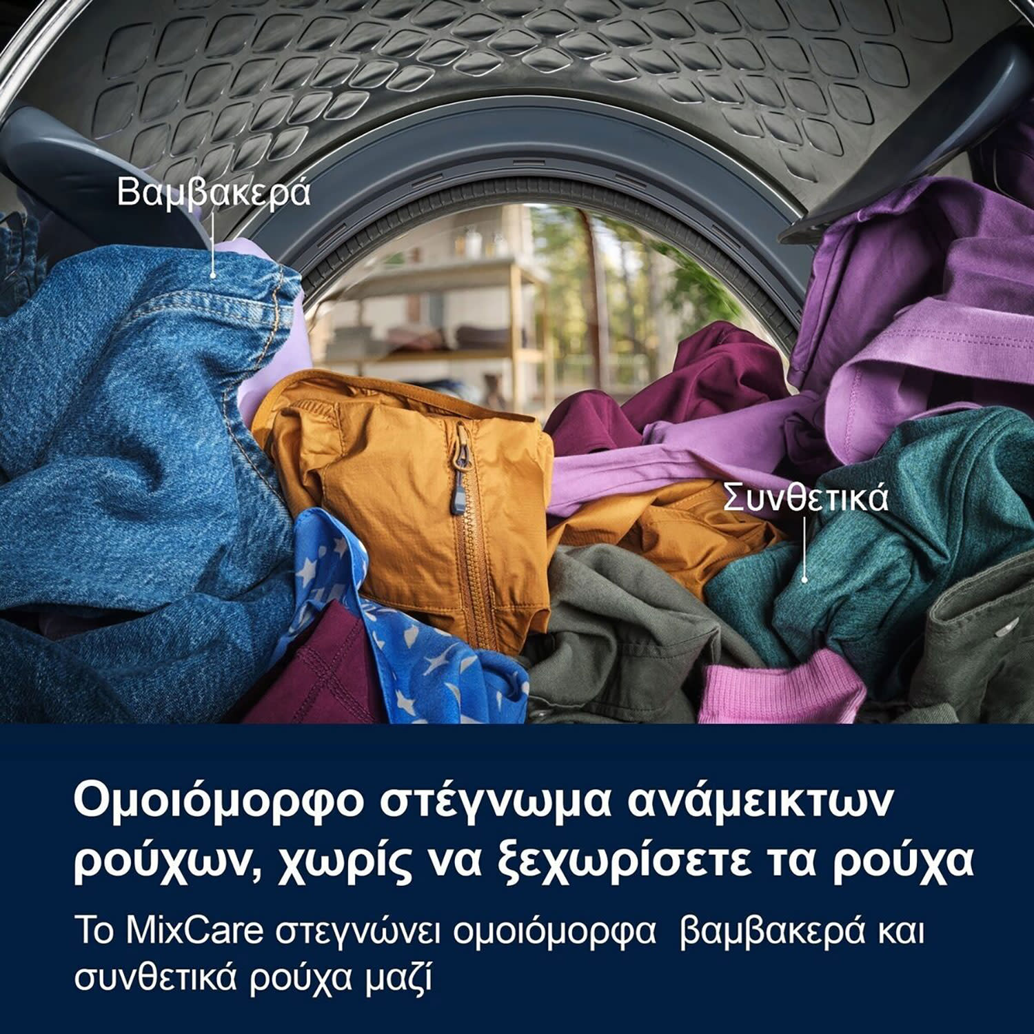 Τέρμα πια το άβολο ξεχώρισμα των ρούχων πριν μπουν στο στεγνωτήριο. Κι αυτό, χάρη στο MixCare, που παρέχει ισχυρό αλλά απαλό στέγνωμα για μικτά φορτία βαμβακερών και συνθετικών, διασφαλίζοντας ότι τα ρούχα στεγνώνουν ομοιόμορφα χωρίς να χρειάζεται διαχωρισμός.