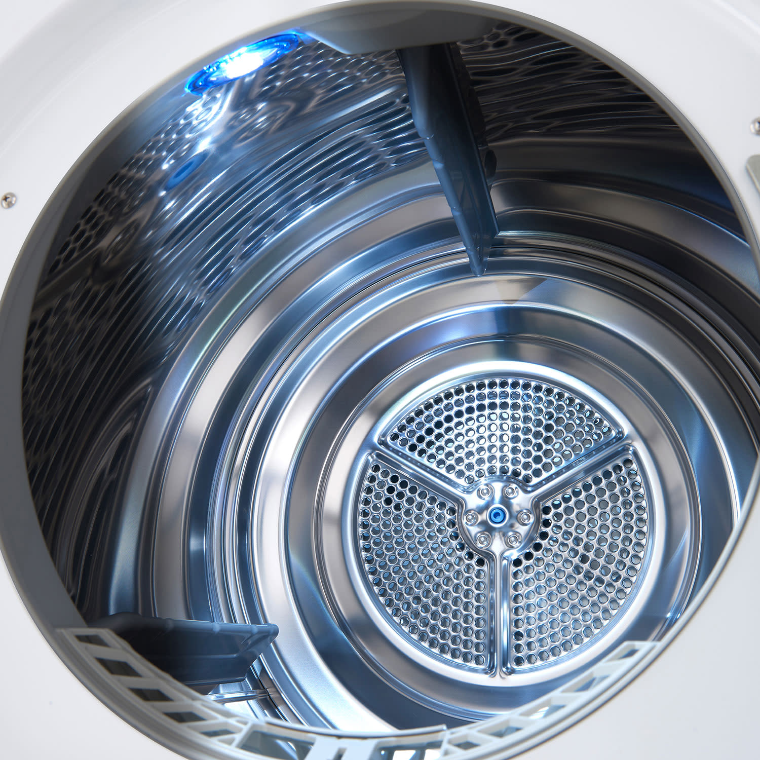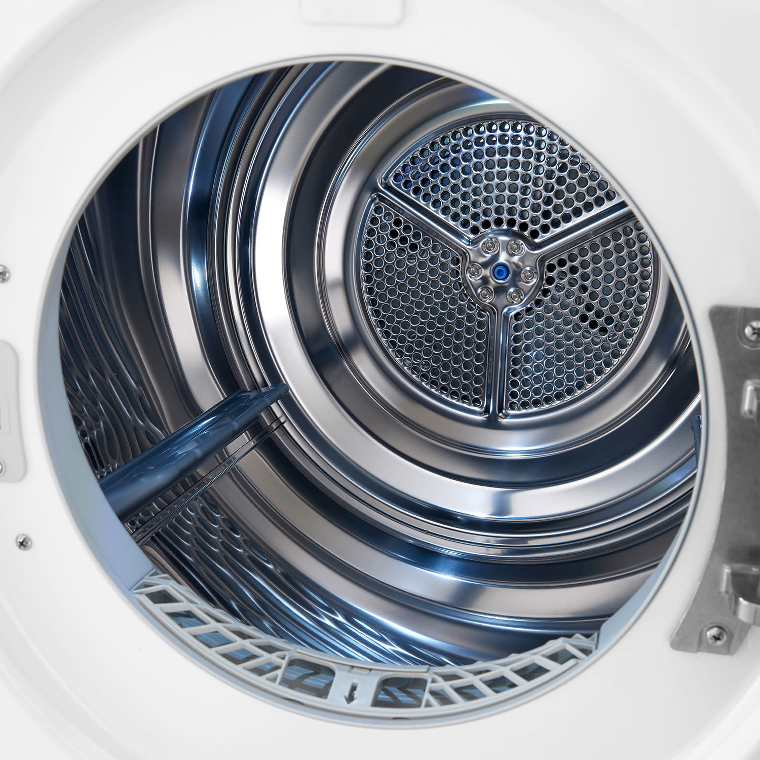 Ο κάδος του έχει άνετη χωρητικότητα 8kg, διαθέτει διπλό φίλτρο που φιλτράρει το χνούδι και το διατηρεί καθαρό, ενώ ειδικοί αισθητήρες ανιχνεύουν αυτόματα τα επίπεδα υγρασίας και ρυθμίζουν τον βέλτιστο χρόνο στεγνώματος.