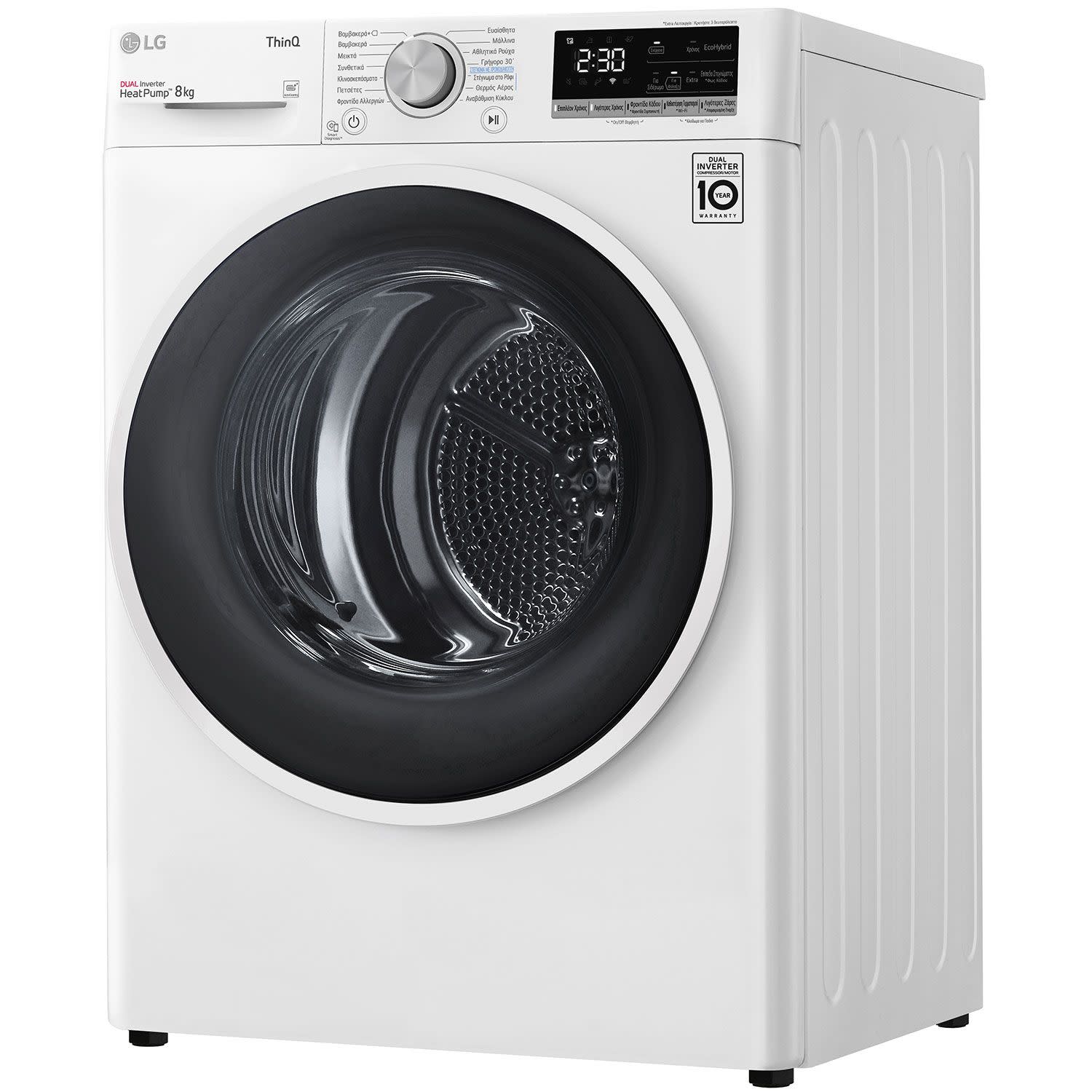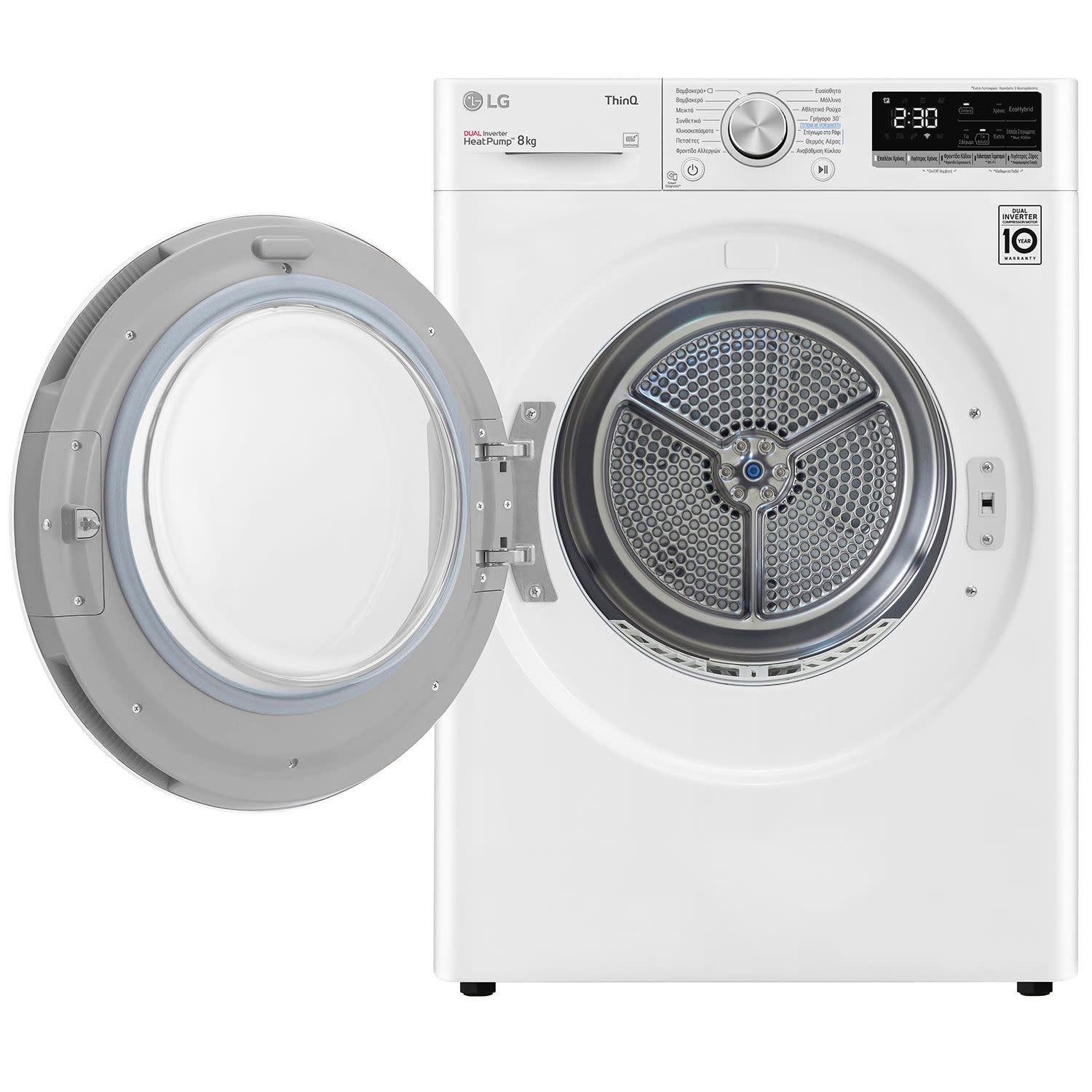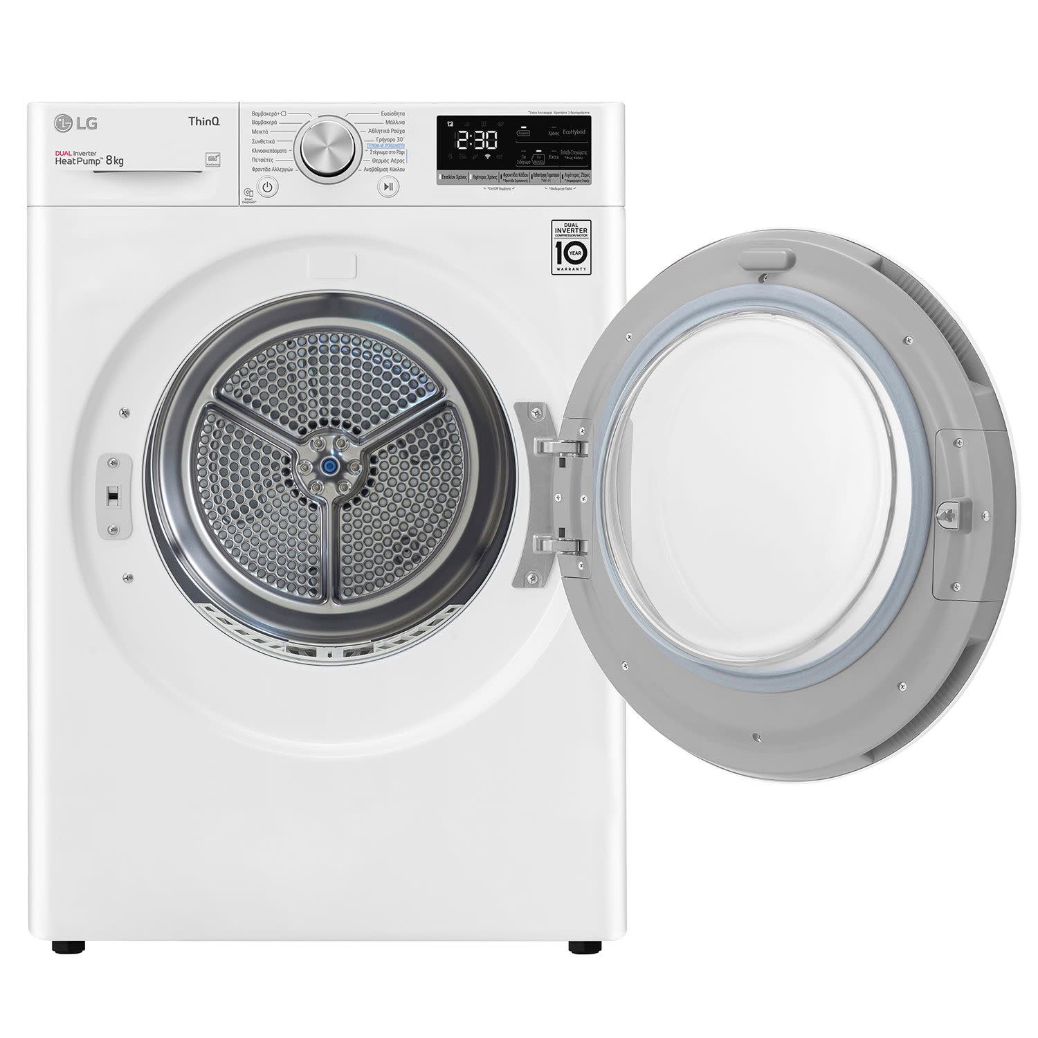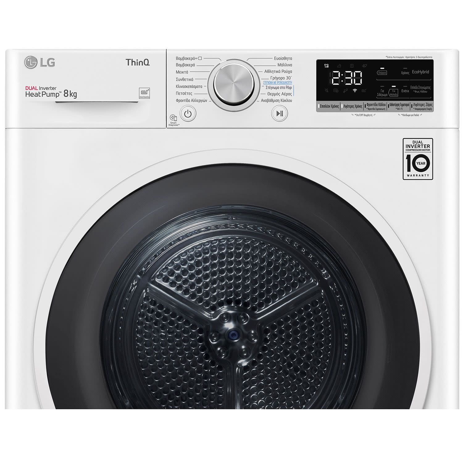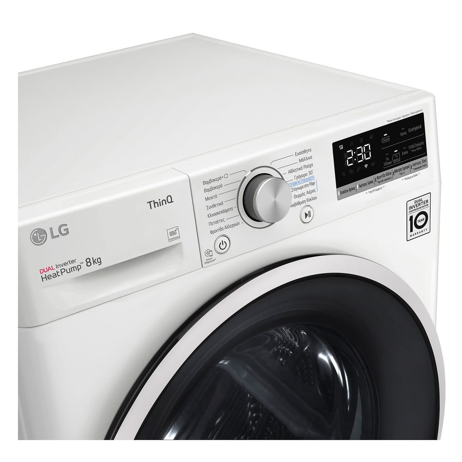 LG στεγνωτήριο με 8kg κάδο, λειτουργία με αντλία θερμότητας, SmartThinQ για απομακρυσμένο έλεγχο μέσω WiFi και SmartDiagnosis για γρήγορη διάγνωση και επίλυση των βλαβών.