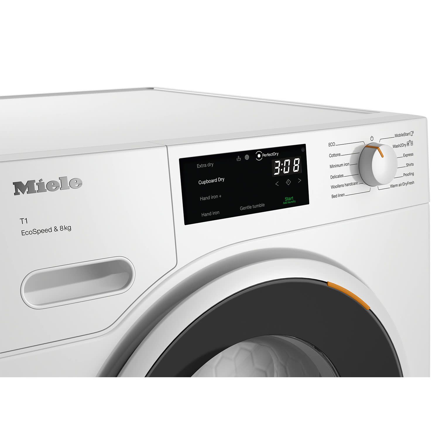 Στεγνωτήριο Miele με χωρητικότητα 8kg και κινητήρα ProfiEco για οικονομική & αθόρυβη λειτουργία. Ο κυψελωτός κάδος και το PerfectCare φροντίζουν απαλά κάθε ύφασμα.