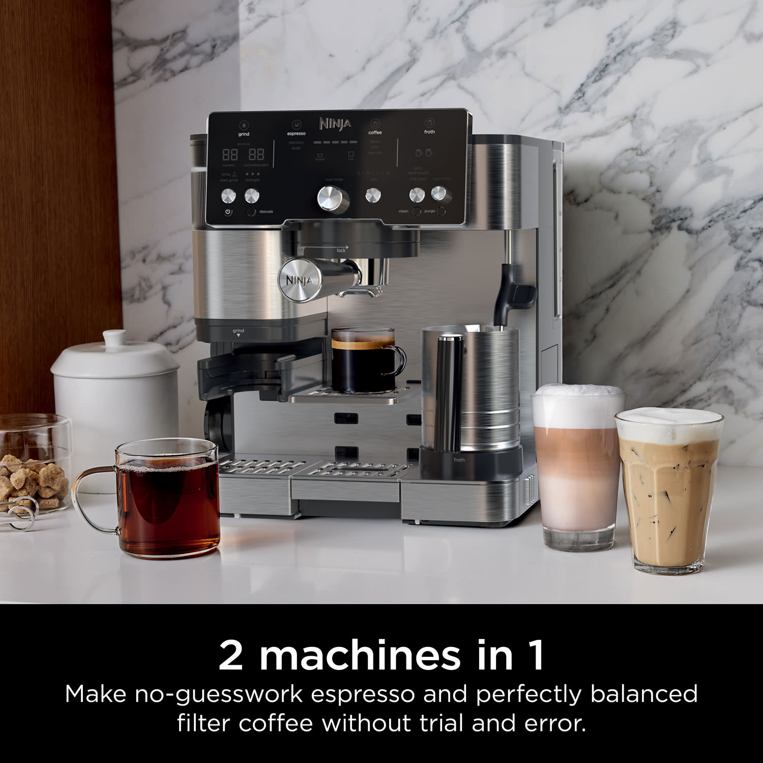 Αυτόματη Καφετιέρα Espresso της Ninja, με 1650W ισχύ και χωρητικότητα δοχείου νερού 2 Lt. Διαθέτει ενσωματωμένο μύλο με 25 ρυθμίσεις αλέσματος, λειτουργία Grind IQ, ενώ ετοιμάζει και καφέ φίλτρου.