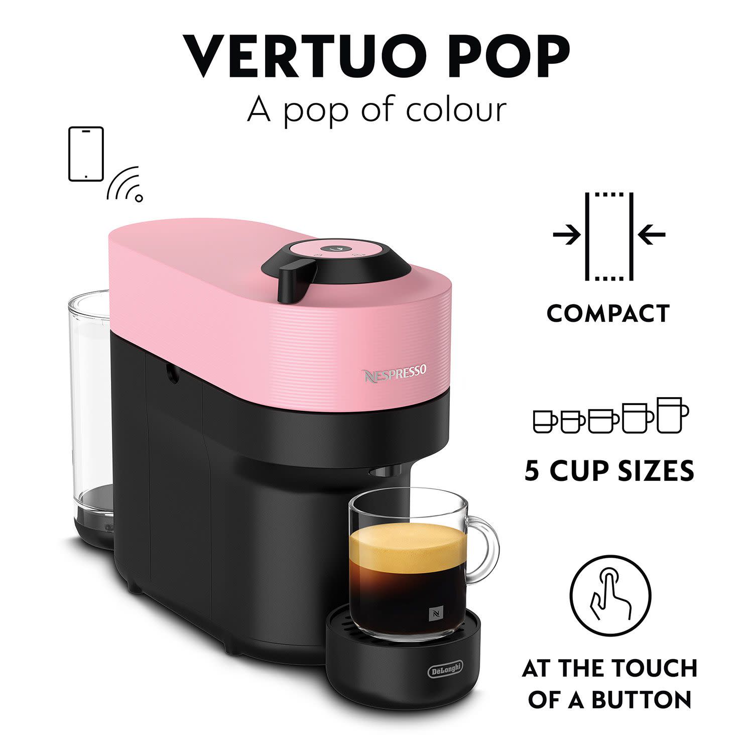 Η Nespresso Vertuo Pop XN9201 καφετιέρα Delonghi, είναι μια μίνιμαλ μηχανή καφέ σε μικρό μέγεθος, για να ταιριάζει απόλυτα σε κάθε στιλ και χώρο. Παράλληλα, παρέχει ευκολία και ευελιξία για να απολαμβάνεις εσύ και η παρέα σου 4 διαφορετικά μεγέθη κάψουλας. Η μικρή κάψουλα για Ristretto, η επόμενη για Espresso, η μεσαία για Double Espresso και Gran Lungo και η αμέσως επόμενη για Signature Mug. Με ένα άγγιγμα ετοιμάζει τον πρωινό σου καφέ, για να μην καθυστερήσεις ούτε λεπτό στη δουλειά, ενώ διαθέτει αυτόματη εξαγωγή κάψουλας, για να κάνει τη χρήση της «παιχνιδάκι»! Τέλος, με την έξυπνη τεχνολογία Bluetooth® και το Wi-Fi, η Vertuo Pop φροντίζει να έχεις πάντα την καλύτερη και πιο σύγχρονη εμπειρία Nespresso, χάρη στην αυτόματη ενημέρωση του λογισμικού της μηχανής.