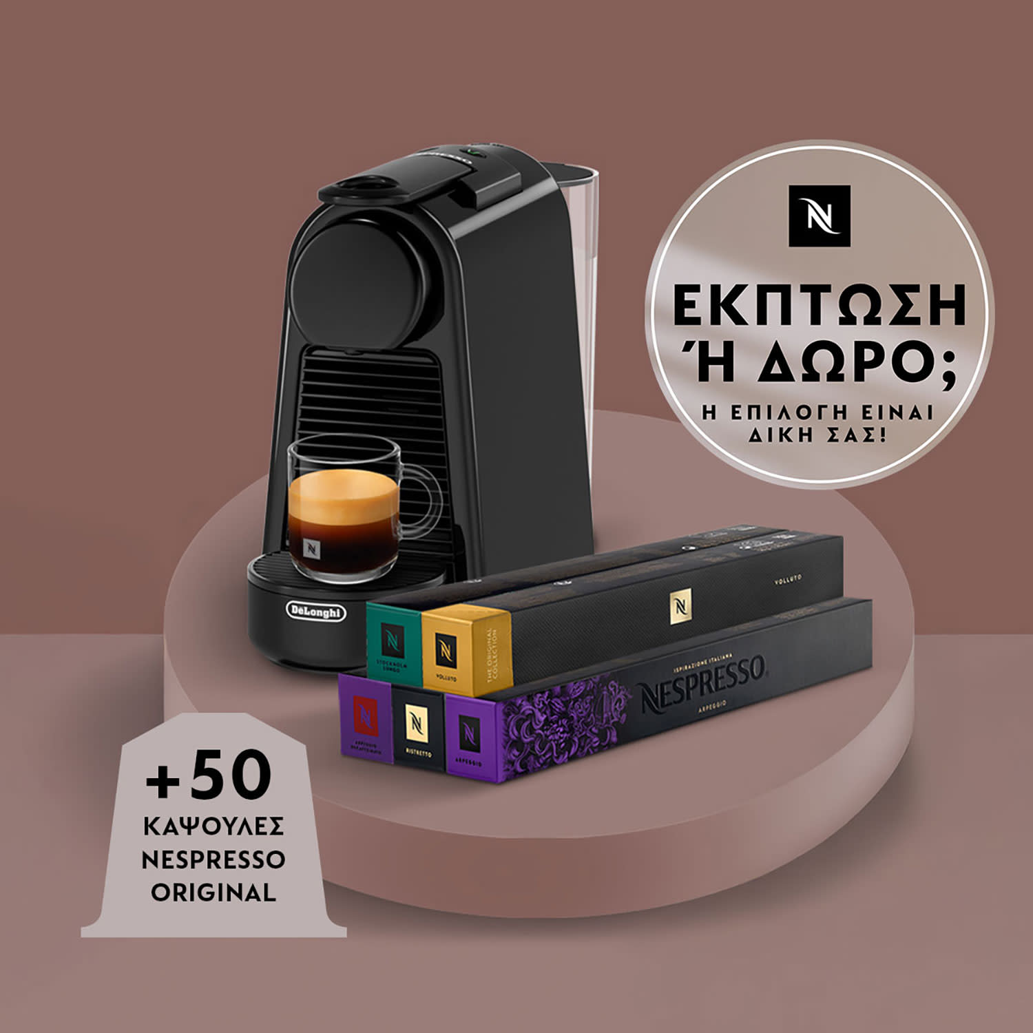 Μαζί με την Essenza Mini της Delonghi θα παραλάβεις και ένα πακέτο με 50 κάψουλες καφέ Nespresso Original! Ανακάλυψε μια αξέχαστη εμπειρία καφέ με τις ποικιλίες Ristretto, Arpeggio, Arpeggio decaf, Stockholm Lungo και Volluto.