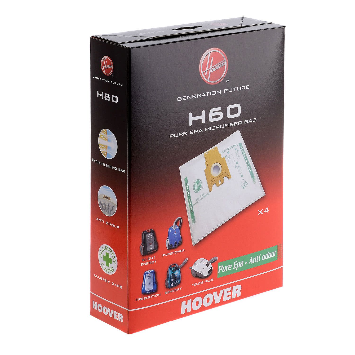 Hoover Σακούλες Σκούπας H60 PureHepa σε συσκευασία τεσσάρων τεμαχίων. Είναι κατασκευασμένες από ανθεκτικό ύφασμα, ενώ διαθέτουν και φίλτρο Pure HEPA, που αποτρέπει τις διαρροές της σκόνης, για απόλυτη υγιεινή του αέρα εκροής. Είναι συμβατές με τις σειρές: FREEMOTION, PURE, PURE POWER, SENSORY, SENSORY EVO, SILENT ENERGY, TELIOS PLUS.