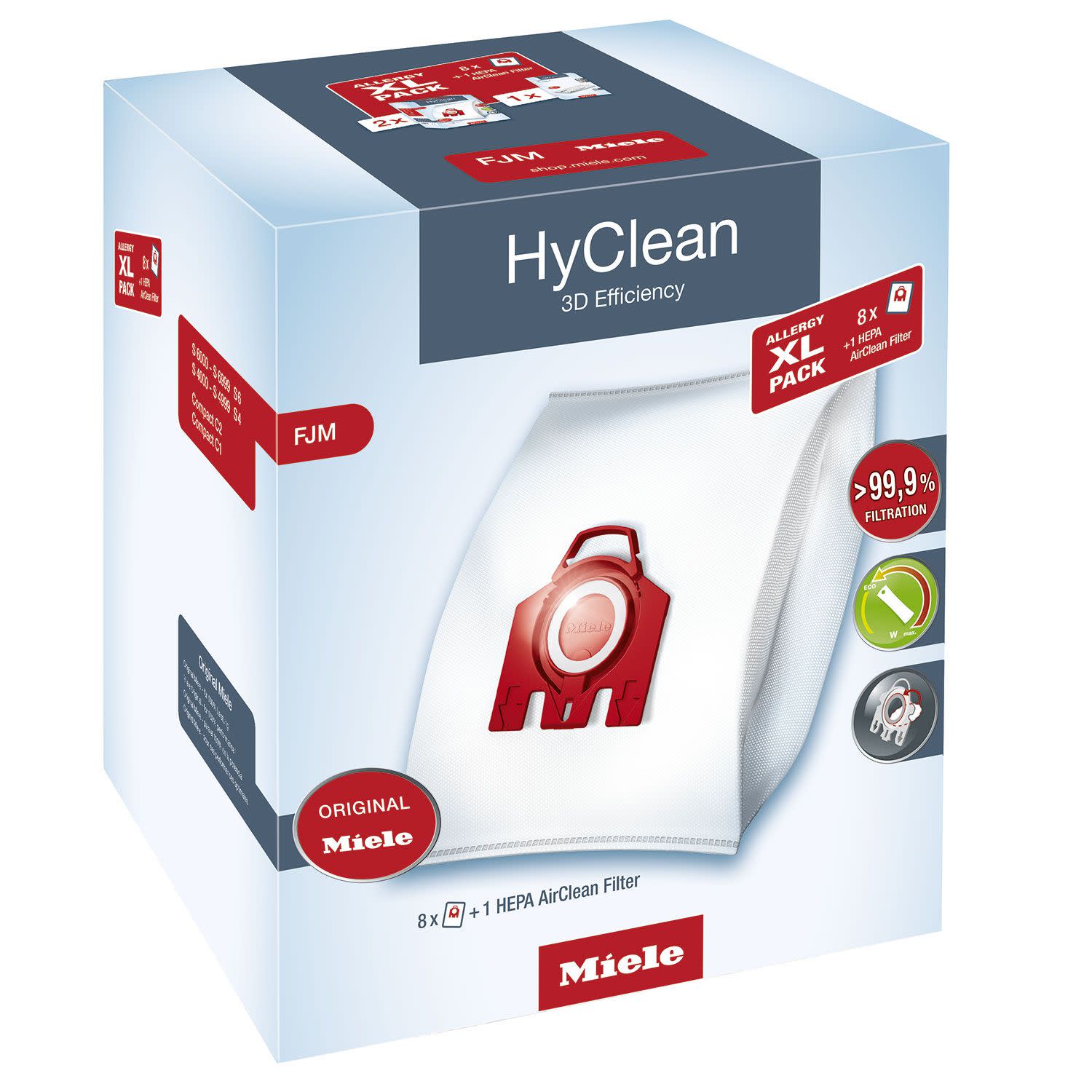Συσκευασία με 8 σακούλες σκούπας Allergy XL HyClean 3D Efficiency FJM και 1 φίλτρο HEPA AirClean, για να διατηρείς την κορυφαία απόδοση της σκούπας Miele.