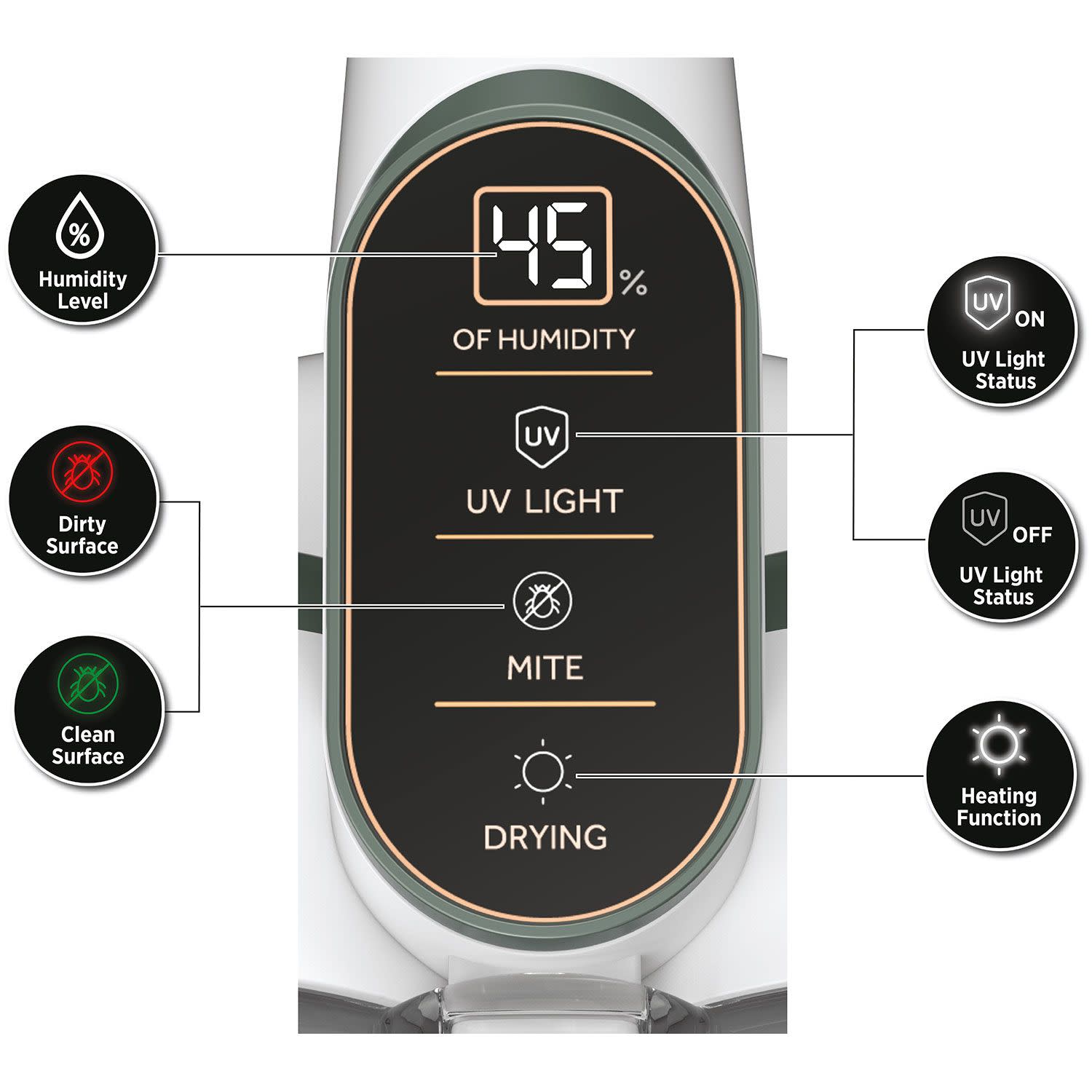 Η premium οθόνη LED είναι διαισθητική και σού δείχνει χρήσιμες πληροφορίες όπως: το επίπεδο υγρασίας που ανιχνεύτηκε, την κατάσταση των λαμπτήρων UV, την κατάσταση του αισθητήρα σκόνης και το βαθμό στεγνώματος.