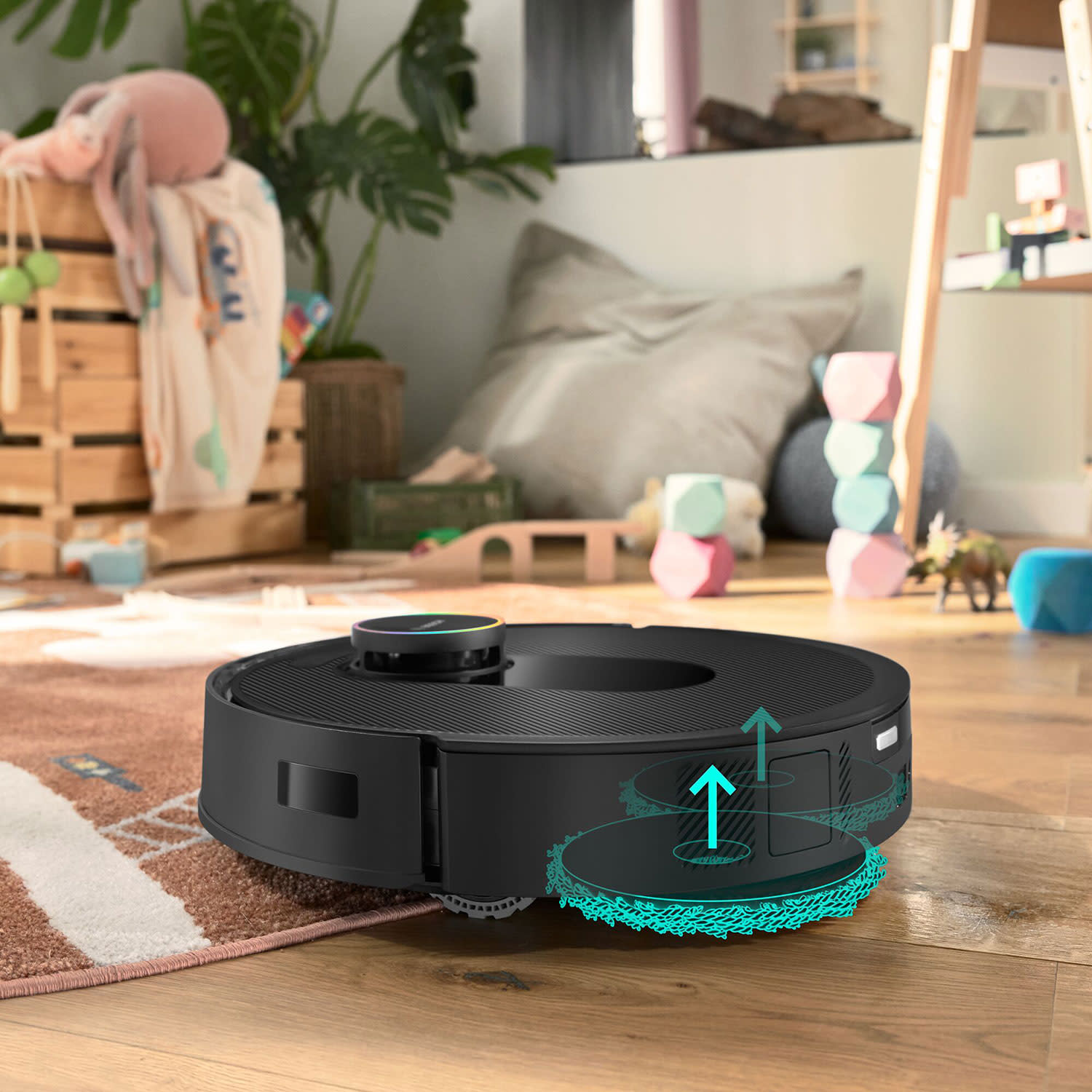 Σκούπισμα και σφουγγάρισμα με πολύ δυνατή αναρρόφηση σκόνης, κάμερα πλοήγησης και αυτοκαθαρισμό των πανιών σφουγγαρίσματος με ζεστό νερό και ζεστό αέρα, για καθαρό σπίτι χωρίς κόπο!
