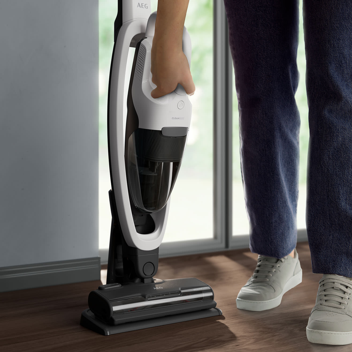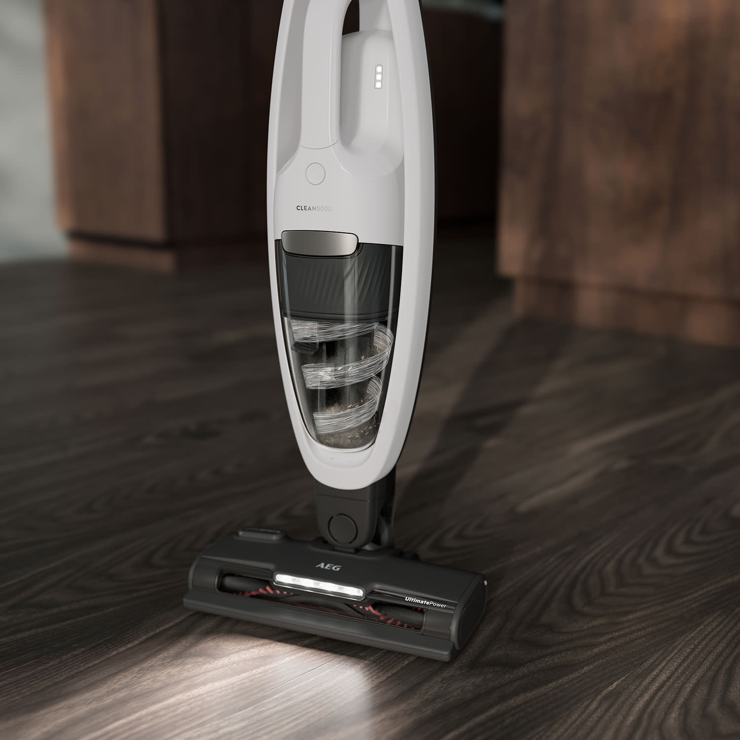 Σκούπα stick της AEG με αυτονομία έως 45min και χωρητικότητα κάδου 300ml. Δες τα πάντα χάρη στον φωτισμό LED στο πέλμα, χρησιμοποίησέ τη ως σκουπάκι χειρός και κάνε την καθαριότητα παιχνιδάκι!