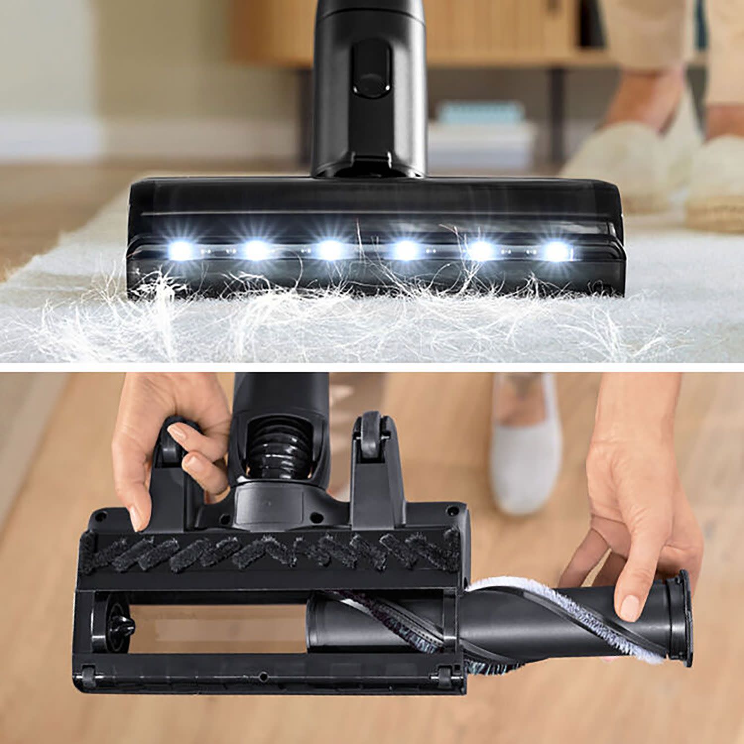 Μαζί με τη σκούπα θα βρεις και όλα τα απαραίτητα εξαρτήματα για αποτελεσματικό και γρήγορο καθαρισμό των επιφανειών του σπιτιού. 1) Πέλμα για σκληρά δάπεδα - Το πέλμα με μαλακή βούρτσα και φωτισμό LED έχει σχεδιαστεί για απαλό, αλλά βαθύ καθαρισμό των ευαίσθητων δαπέδων. Η μαλακή βούρτσα αποτρέπει τις γρατσουνιές και μειώνει το μπλέξιμο τριχών έως και 5 φορές, χάρη στη μεγάλη της διάμετρο. Η βούρτσα είναι πλενόμενη, με νερό βρύσης. 2) Μαλακή βούρτσα για έπιπλα - Οι μαλακές τρίχες της βούρτσας επίπλων είναι ιδιαίτερα χρήσιμες για τον καθαρισμό συρταριών, τραπεζιών, βιβλιοθηκών και άλλων ευαίσθητων επιφανειών. Χάρη στην περιστροφή 360°, καθαρίζεις εύκολα κάθε σημείο. 3) XXL ακροφύσιο για ταπετσαρίες - Χάρη στο μεγάλο του άνοιγμα, μαζεύει περισσότερη σκόνη σε λιγότερο χρόνο σε σχέση με μικρότερα ακροφύσια για ταπετσαρίες. Επιπλέον, χάρη στην περιστροφή 360°, κάνει τον καθαρισμό ακόμα πιο βολικό.
