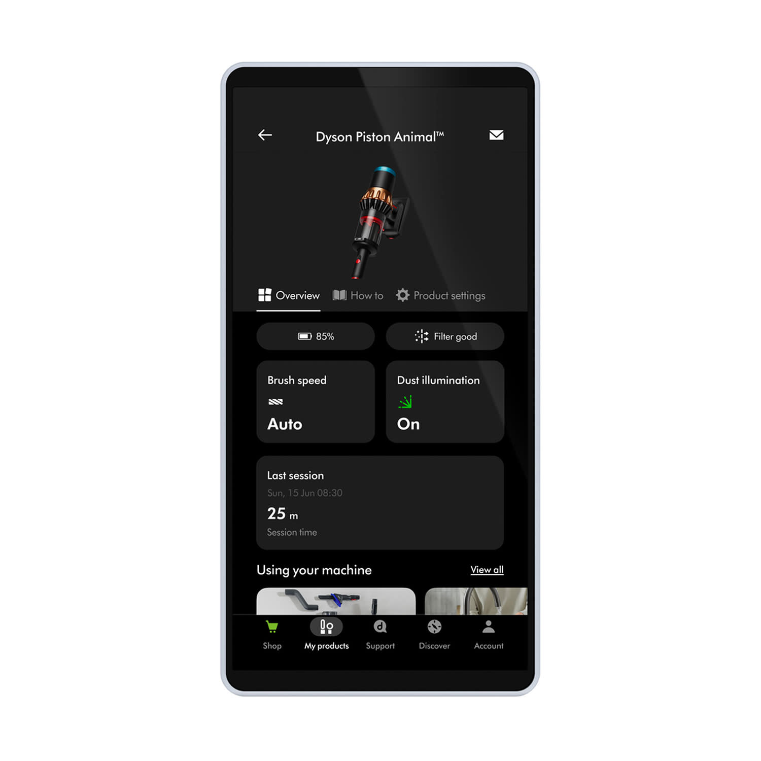 Ειδικά σχεδιασμένη για τις καθημερινές ανάγκες κάθε σπιτιού, η επαναφορτιζόμενη σκούπα stick V16 Piston Animal της Dyson καθαρίζει σε βάθος όλα τα δάπεδα! Το νέο μοτέρ Hyperdymium™ 900w είναι το πιο ισχυρό μοτέρ της Dyson, προσφέροντας 315AW ισχυρής απορρόφησης. Σκούπισε ξανά και ξανά χωρίς άδειασμα, χάρη στην τεχνολογία CleanCompaktor™ που συμπιέζει σκόνη και βρωμιά, συγκρατώντας τα στον κάδο για έως 30 ημέρες. Η κεφαλή καθαρισμού All Floor Cones™ Sense καθαρίζει σε βάθος χαλιά και σκληρά δάπεδα χωρίς να τα φθείρει, ενώ οι τρίχες δεν μπλέκονται στη ράβδο, καθιστώντας την ιδανική για σπίτια με κατοικίδια. Θέλεις να έχεις τον απόλυτο έλεγχο της σκούπας σου; Κατέβασε την εφαρμογή MyDyson™ και λάβε ειδοποιήσεις σε πραγματικό χρόνο για ενημερώσεις, καθώς και για τη συντήρηση της συσκευής.