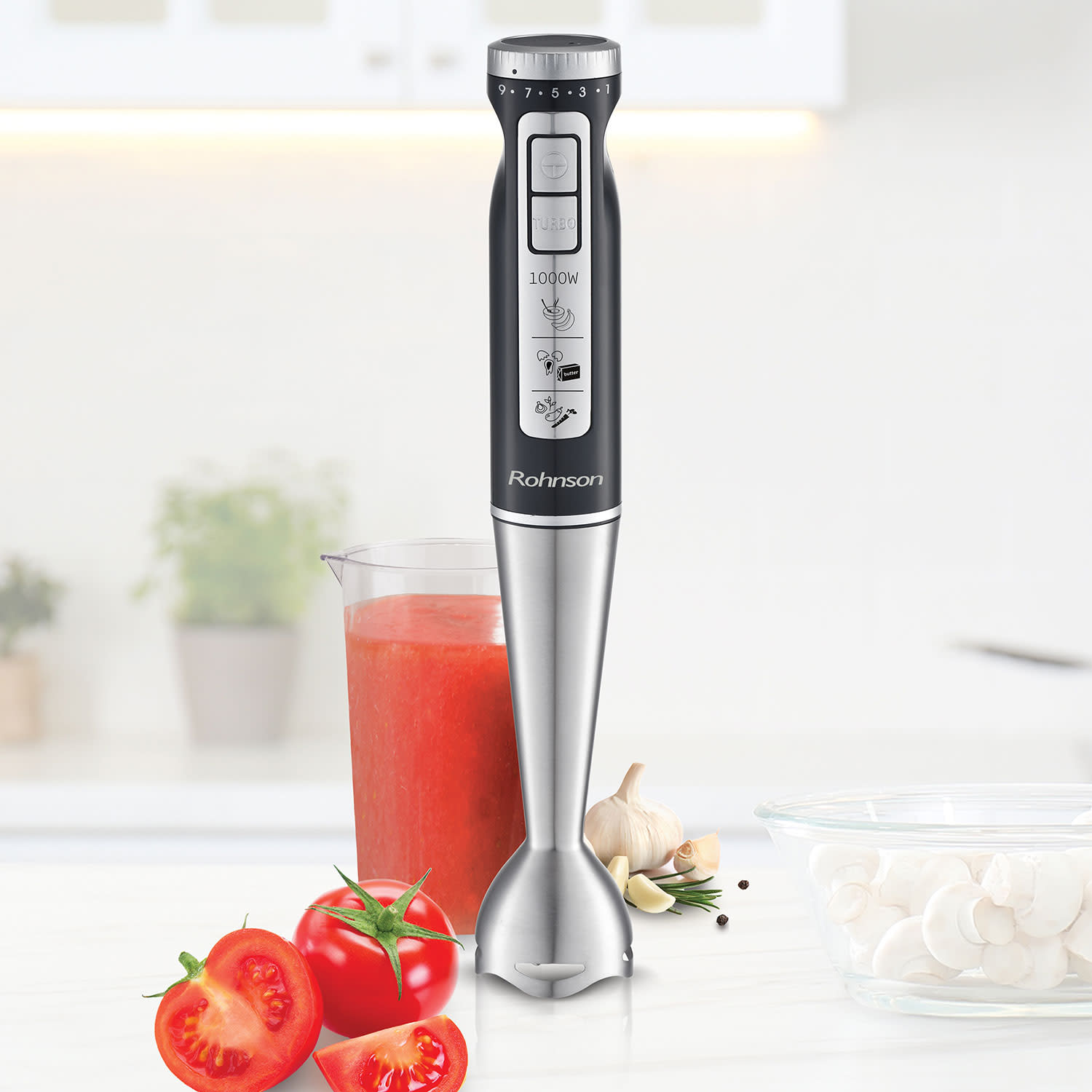 Ραβδομπλέντερ της Rohnson με 3 ισχυρές λεπίδες και 9 ταχύτητες που βγάζουν… «knock-out» ακόμα και τα πιο απαιτητικά υλικά. Έχει ισχύ 1000W και συνοδεύεται από δοχείο ανάμειξης.