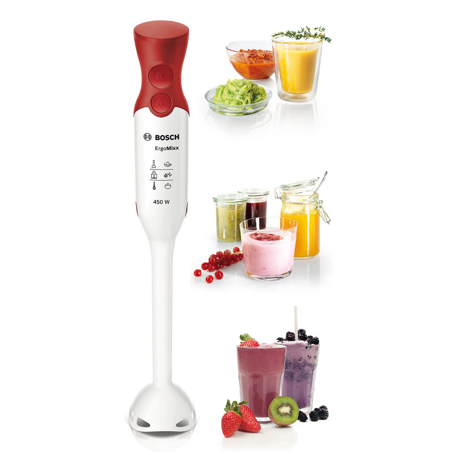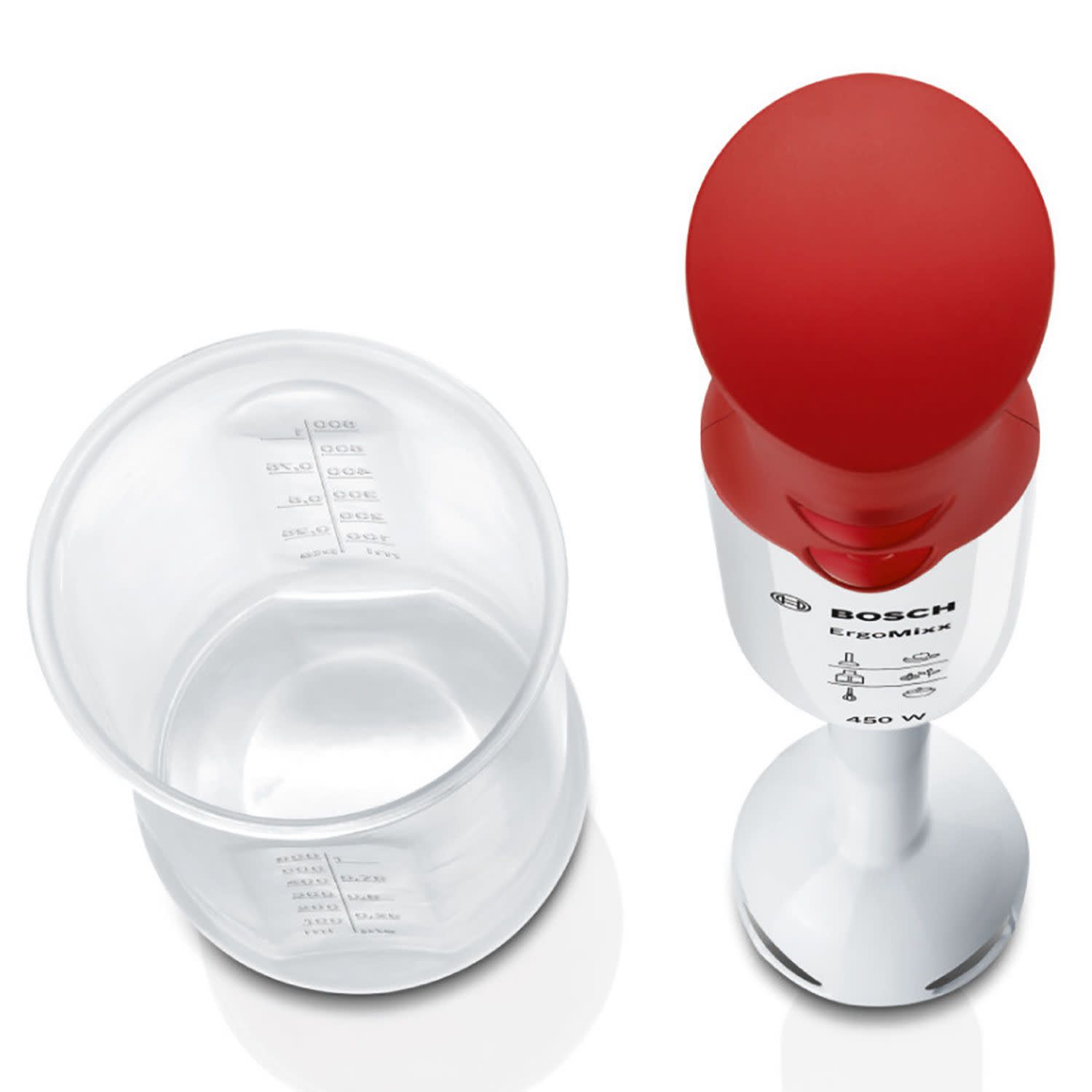 Ραβδομπλέντερ της Bosch με ισχύ 450W και 4 λεπίδες QuattroBlade με AntiSplash λειτουργία. Έχει εργονομικό σχεδιασμό για να το χειρίζεσαι εύκολα και έρχεται με δοχείο – δοσομετρητή.