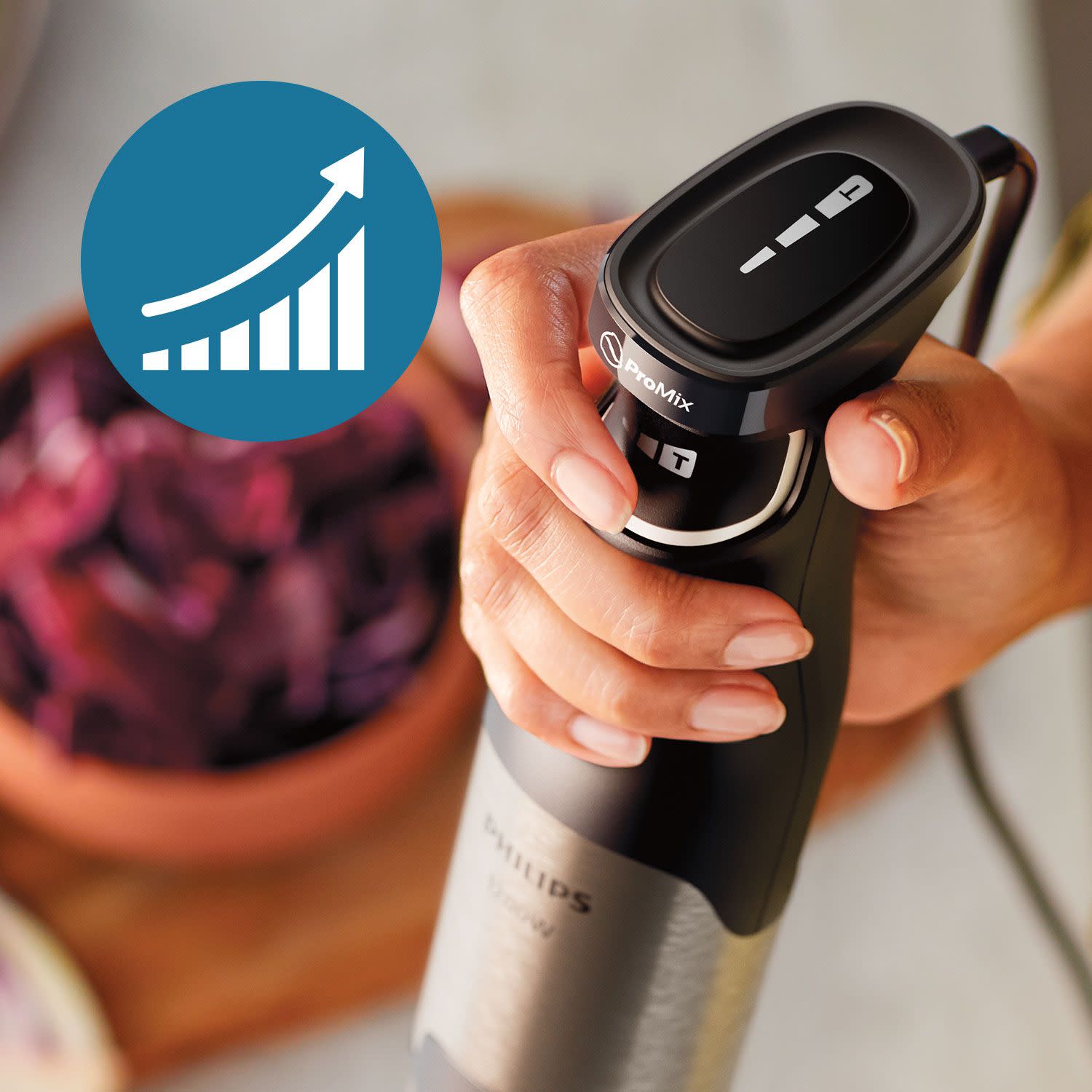 Αν πάλι θέλεις να αυξήσεις σταδιακά την ισχύ ανάδευσης, η τεχνολογία ProMix σού δίνει τη δυνατότητα να επιλέξεις ανάμεσα σε διαφορετικές διαβαθμίσεις ταχύτητας, ανάλογα με τις ανάγκες της κάθε παρασκευής.