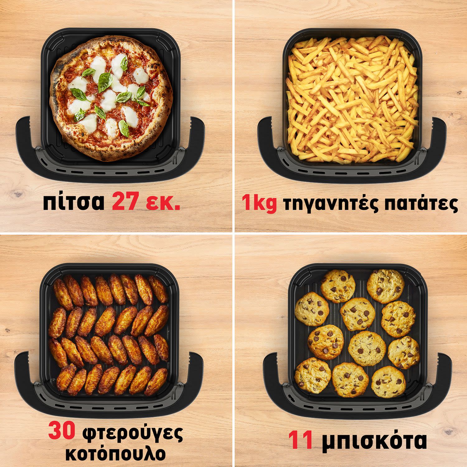 Τηγανητές πατάτες, κοτομπουκιές, ψάρι, πίτσα, κουλουράκια και πολλά άλλα 10 προκαθορισμένα προγράμματα (Φρέσκια πίτσα, κατεψυγμένη πίτσα, τηγανητές πατάτες, Κοτομπουκιές, φτερούγες κοτόπουλου, ψάρι, λαχανικά, μπέικον, μπισκότα, αποξήρανση), για να μπορείς να απολαμβάνεις τα αγαπημένα σου γεύματα εύκολα, γρήγορα και… στα καλύτερά τους!