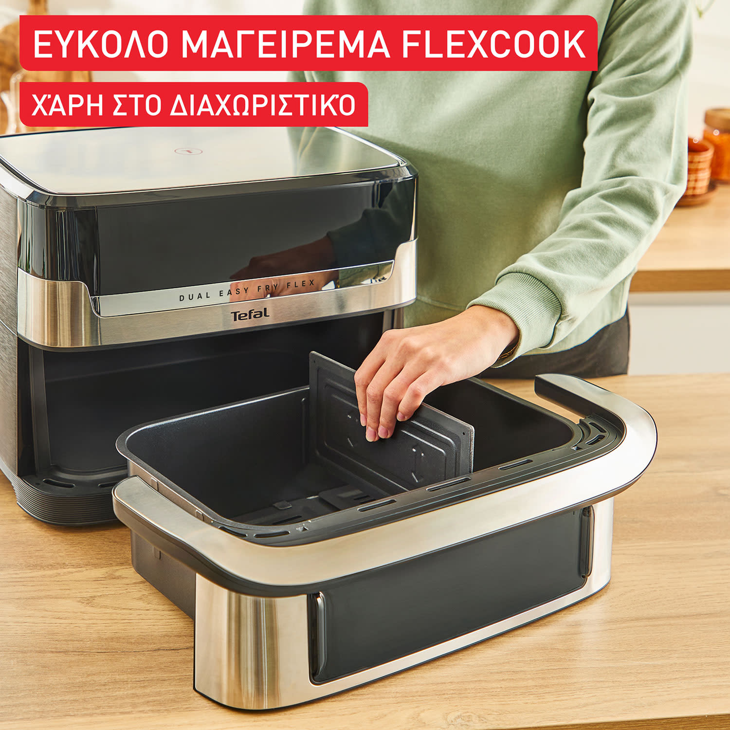 Μεγάλος κάδος 9Lt, ισχύς-αστραπή στα 2.700W και ταυτόχρονο μαγείρεμα χάρη στην τεχνολογία FlexCook, με 7 αυτόματα προγράμματα. Εμπνεύσου και δημιούργησε με τη φριτέζα αέρος της Tefal.