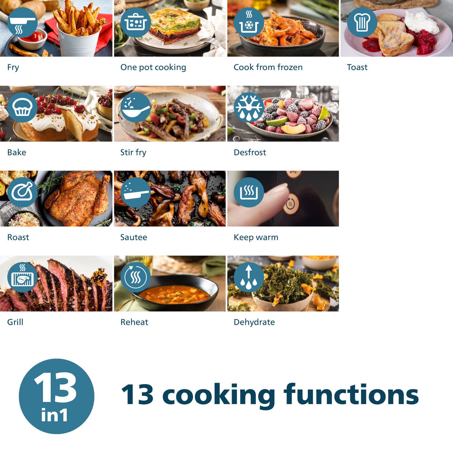 Το νέο σου Air fryer διαθέτει 13 τρόπους λειτουργίας για κάθε σου ανάγκη! Τηγανίζεις στον αέρα, ψήνεις, ψήνεις στο γκριλ και άλλα. Ρύθμισε την ώρα και τη θερμοκρασία με μη αυτόματο τρόπο ή χρησιμοποίησε τις προκαθορισμένες λειτουργίες για να ξεκλειδώσεις 13 διαφορετικούς τρόπους μαγειρέματος στα χέρια σου, συμπεριλαμβανομένης της αναθέρμανσης, της απόψυξης και της διατήρησης της θερμοκρασίας.