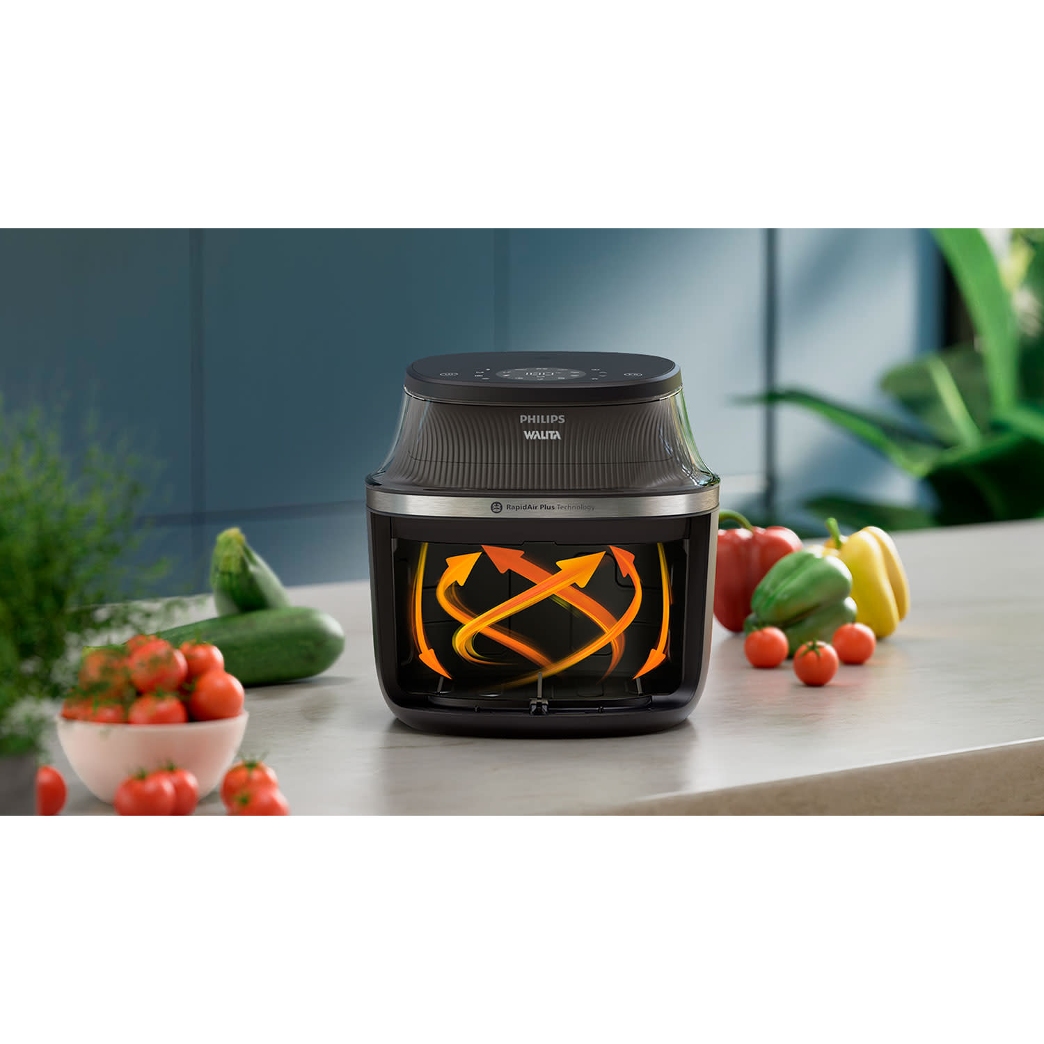 Απόλαυσε υγιεινά γεύματα, με τραγανή κρούστα και τρυφερά στο εσωτερικό με έως και 90% λιγότερα λιπαρά, χάρη στην τεχνολογία Rapid Air Plus. Και για περισσότερη έμπνευση; Κατέβασε την εφαρμογή HomeID για να ανακαλύψεις νόστιμες συνταγές, προσαρμοσμένες στα γούστα σου.