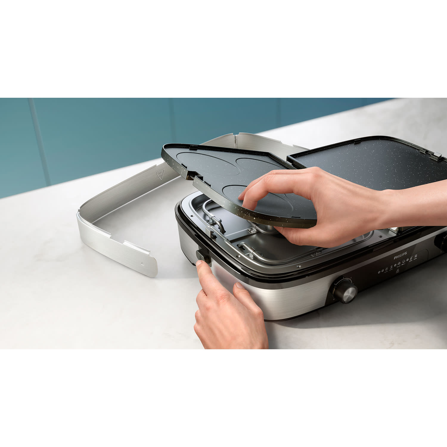 - 2 ζώνες θέρμανσης / Αναστρέψιμες πλάκες / Επιφάνεια 1.400 cm² / Προστατευτικό πιτσιλίσματος