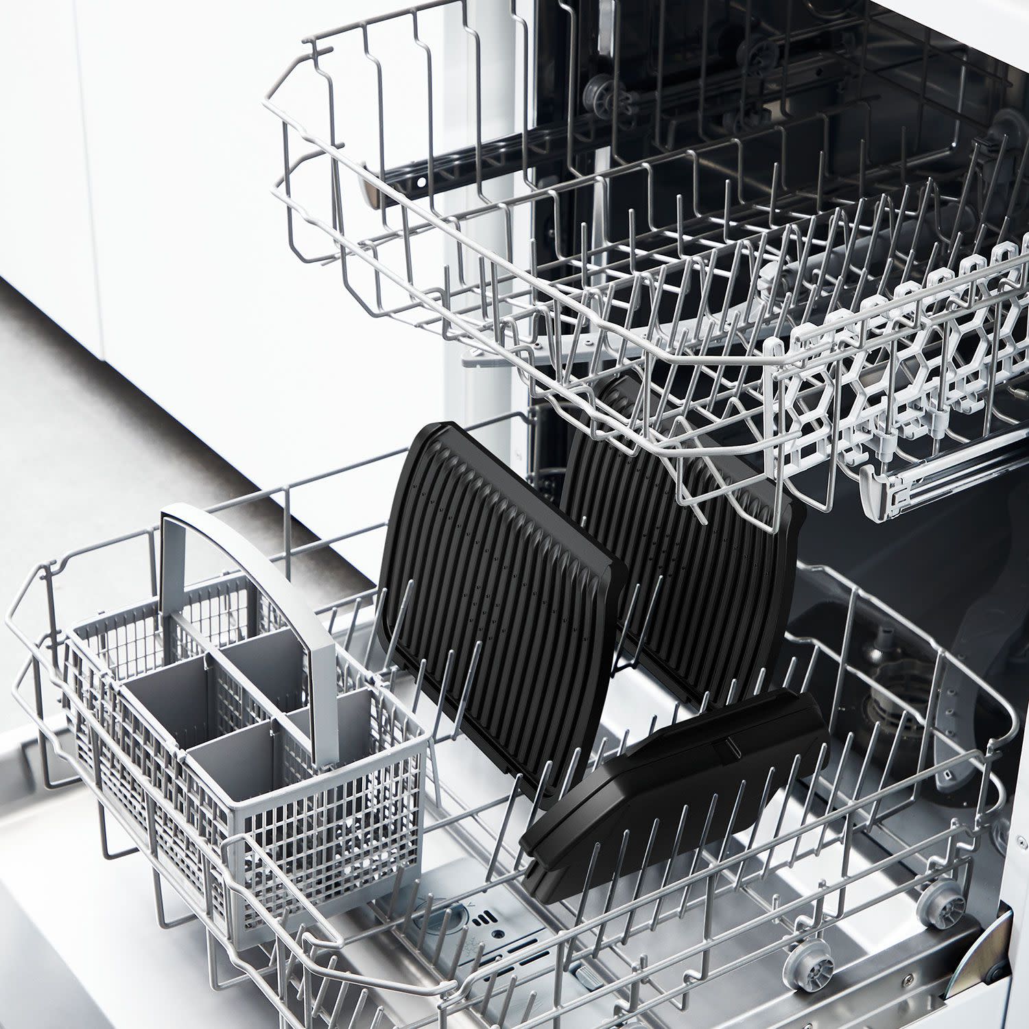 Πλύνε τις αποσπώμενες πλάκες και τον δίσκο συλλογής λίπους πιο εύκολα και οικονομικά από ποτέ, μιας και μπαίνουν στο πλυντήριο πιάτων. Για καθαριότητα χωρίς κόπο!