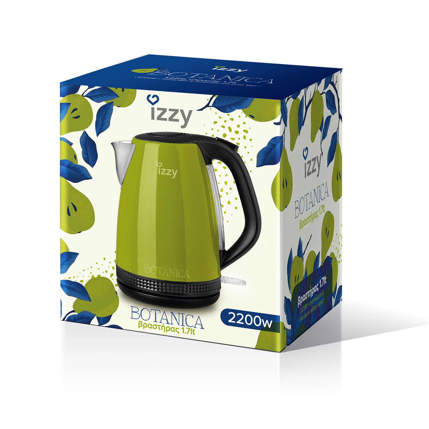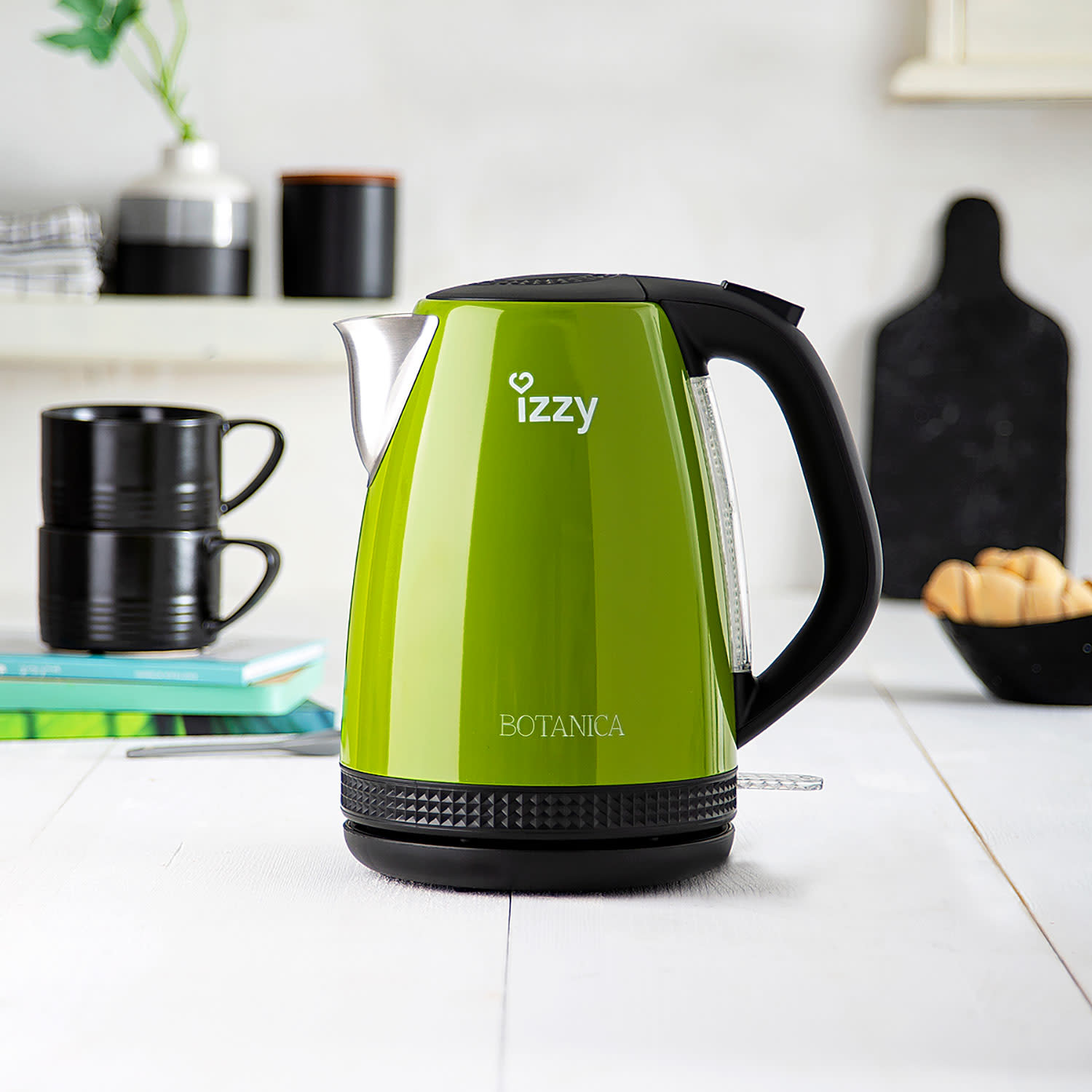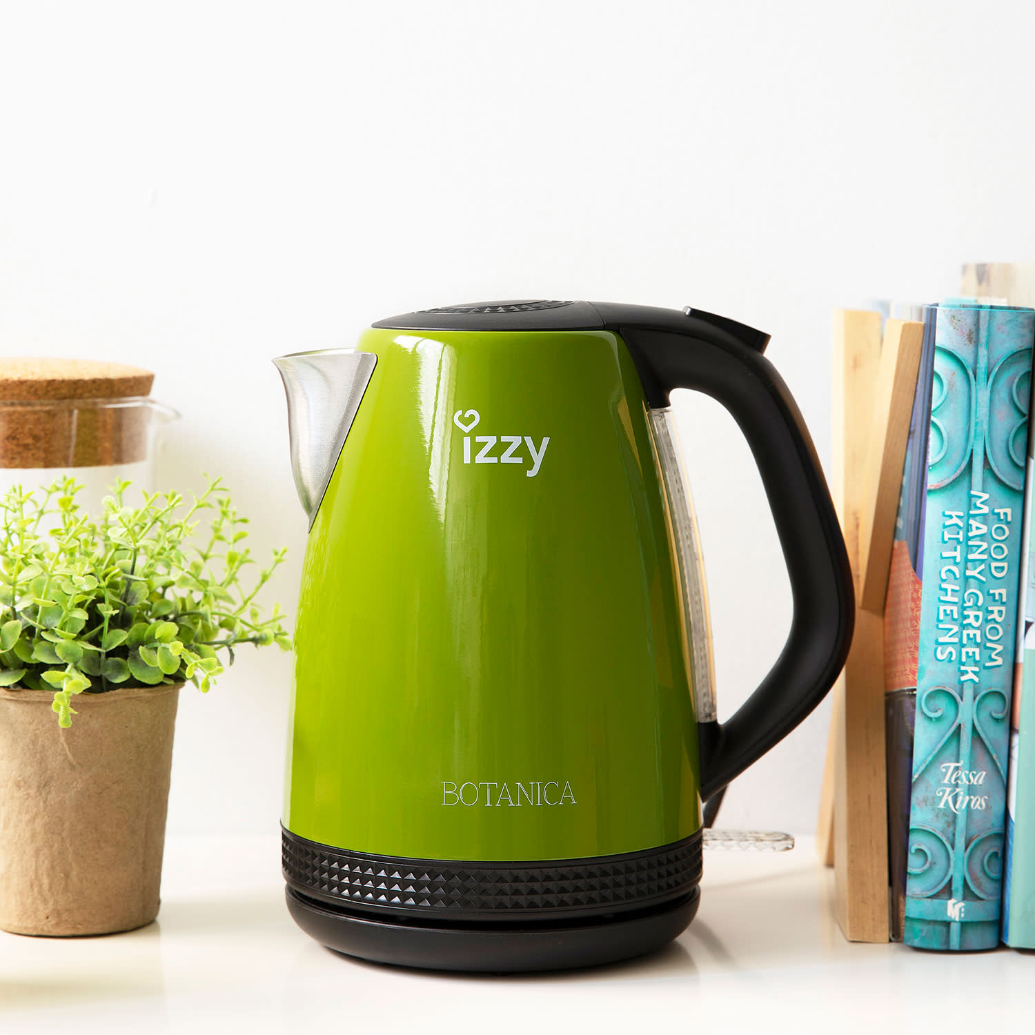 Βραστήρας Izzy σε πράσινο χρώμα, με ισχύ 2200W και χωρητικότητα 1,7lt. Διαθέτει αποσπώμενο φίλτρο νερού, καλυμμένη αντίσταση και προστασία κατά της υπερθέρμανσης για μέγιστη ασφάλεια.